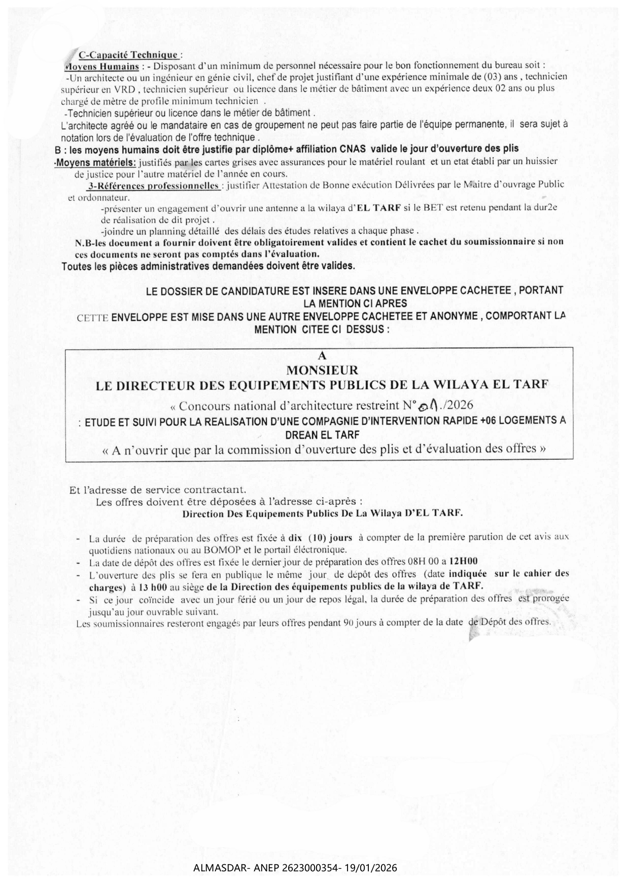 الزبون: DIRECTION DES EQUIPEMENT PUBLICS DE LA WILAYA D'ELTAREF رقم ANEP 2623000354 تاريخ النشر: 2026-01-19 عدد الصفحات: 1/2