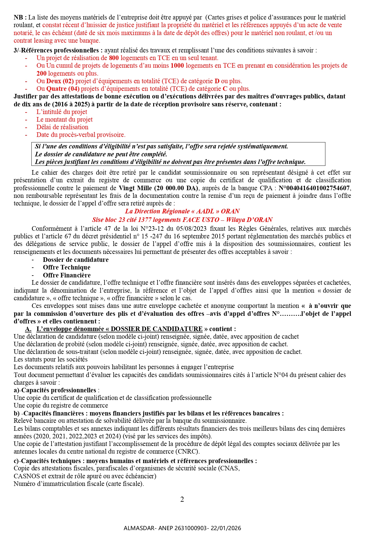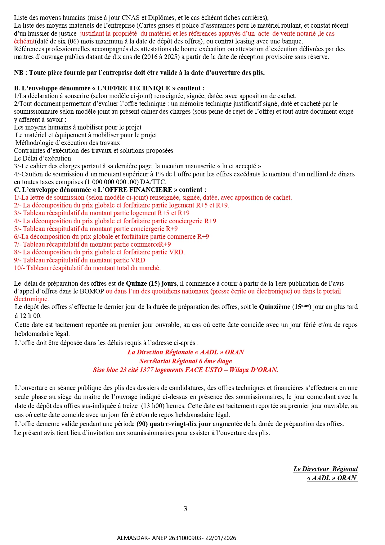 الزبون: -AADL- DIRECTION REGIONALE D’ORAN رقم ANEP 2631000903 تاريخ النشر: 2026-01-22 عدد الصفحات: 3/4