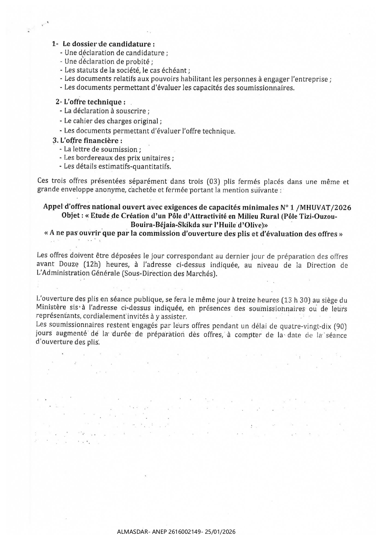 الزبون: MINISTER£ DE L'HABITAT, DE LURBANISME ET DE LA VILLE ET DE L'AMENAGEMENT DU TERRITO]RE رقم ANEP 2616002149 تاريخ النشر: 2026-01-25 عدد الصفحات: 1/2