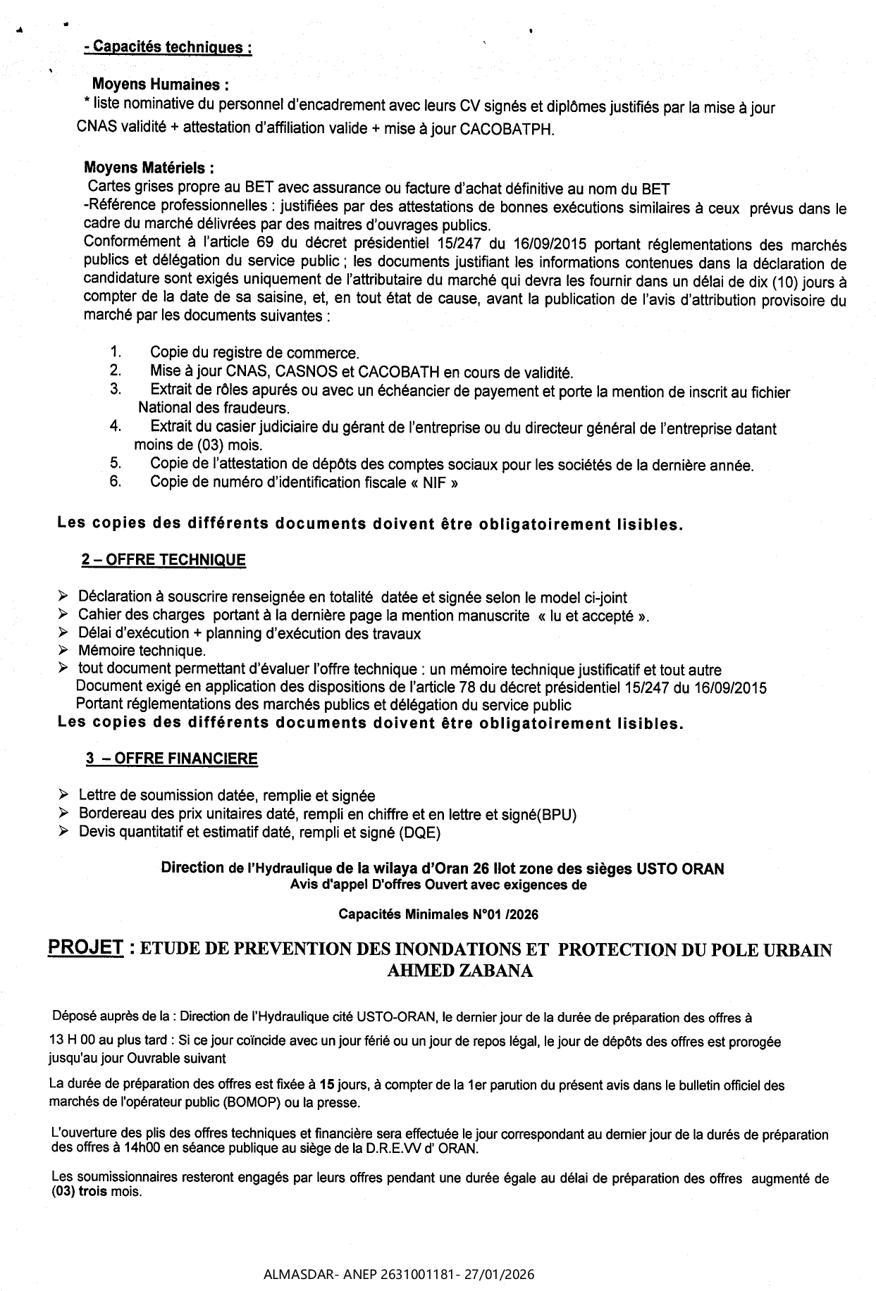 الزبون: DIRECTION DE L'HYDRAULIQUE DE LA WILAYA D'ORAN رقم ANEP 2631001181 تاريخ النشر: 2026-01-27 عدد الصفحات: 1/2