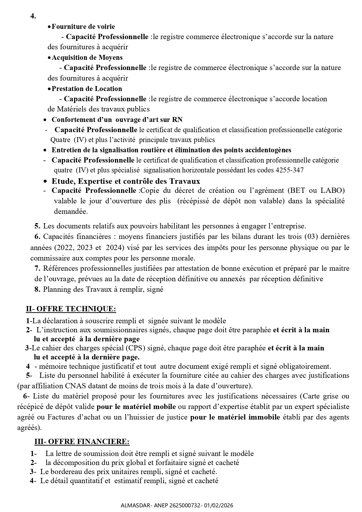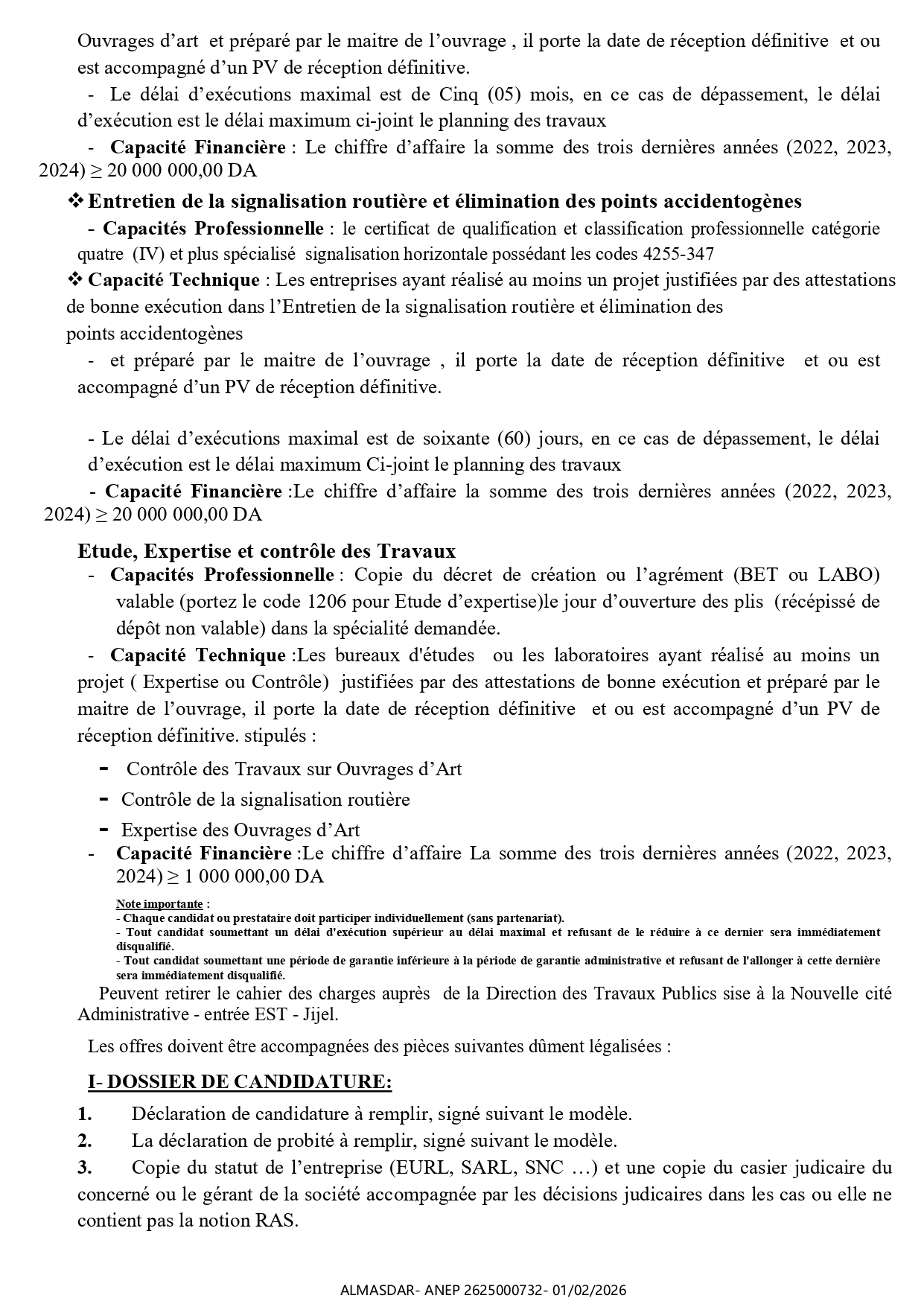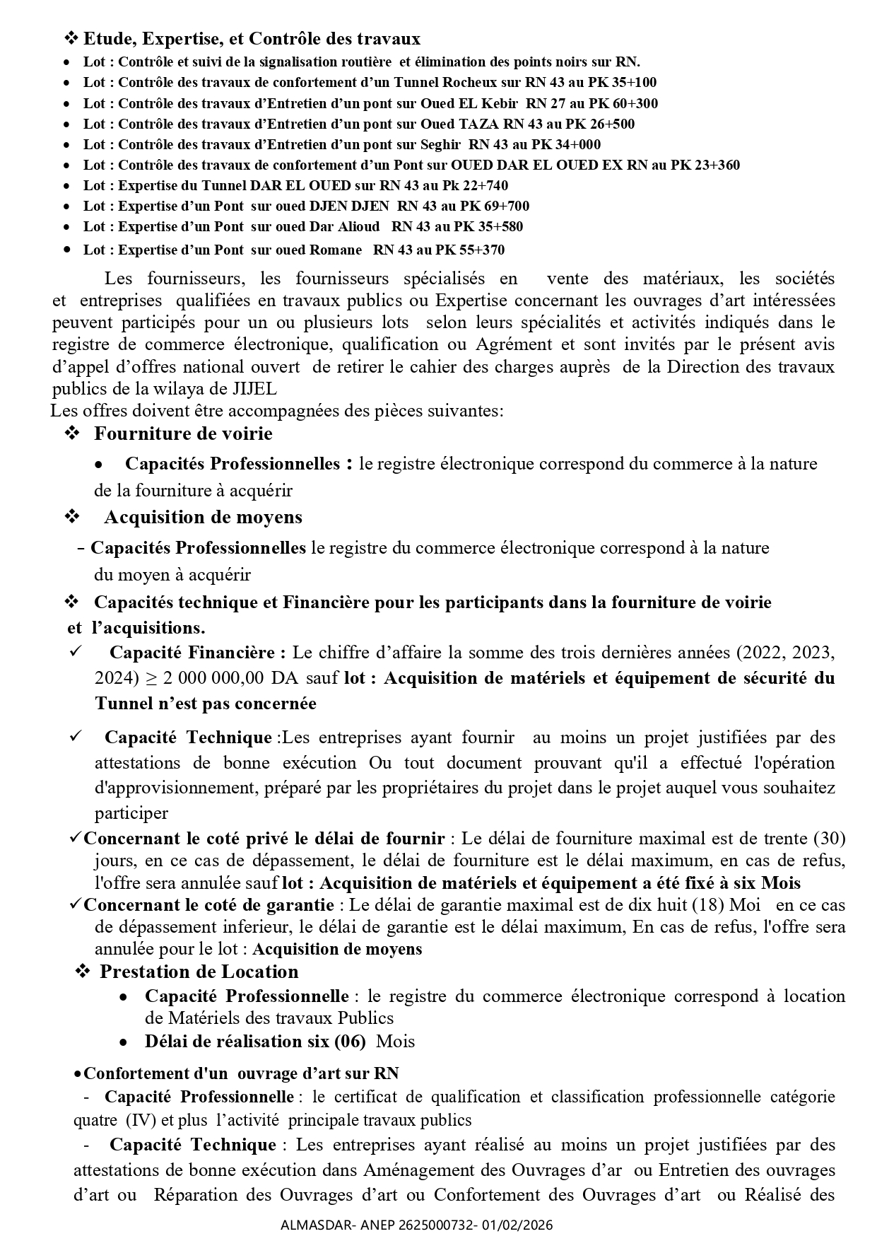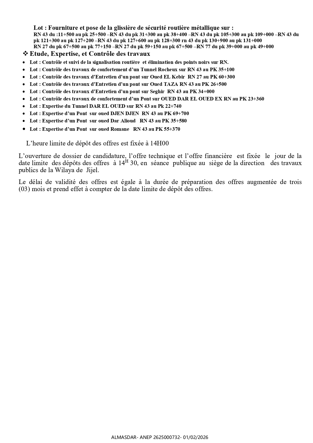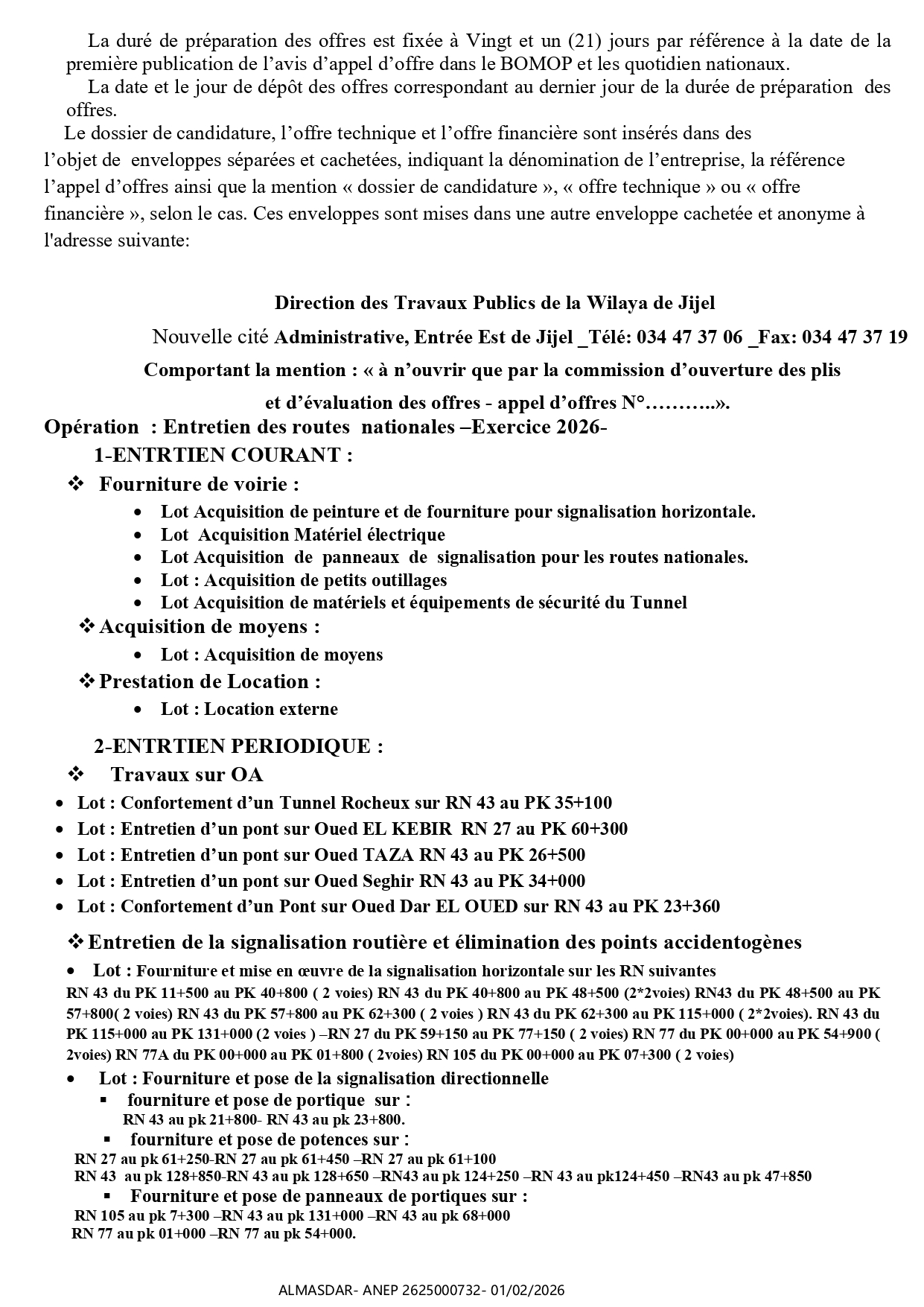 الزبون: DIRECTION DES TRAVAUX PUBLICS WILAYA DE JIJEL رقم ANEP 2625000732 تاريخ النشر: 2026-02-01 عدد الصفحات: 1+1/2