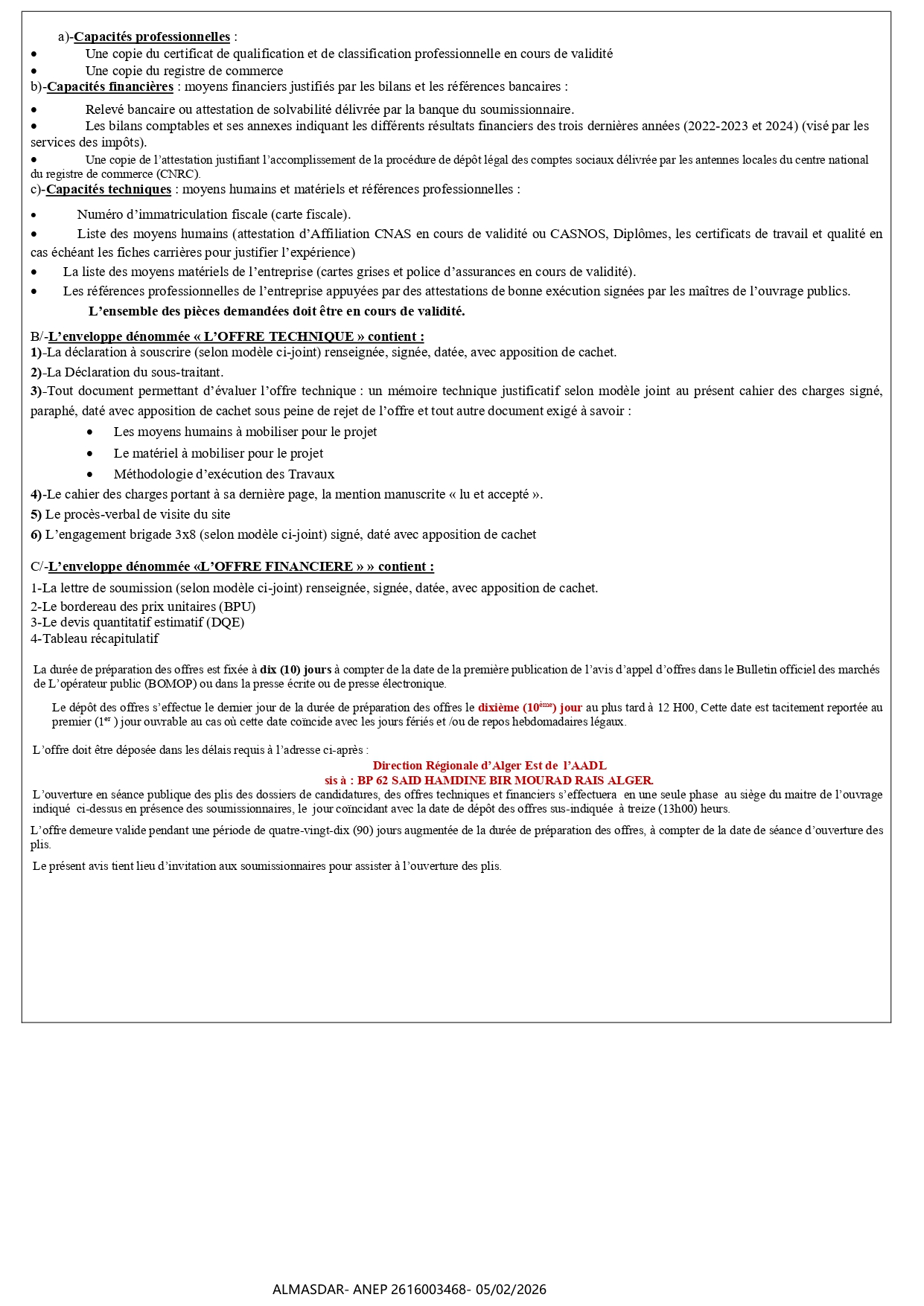الزبون: AGENCE NATIONALE DE L’AMELIORATION ET DU DEVELOPPEMENT DU LOGEMENT -AADL - DIRECTION REGIONALE D رقم ANEP 2616003468 تاريخ النشر: 2026-02-05 عدد الصفحات: 1/2
