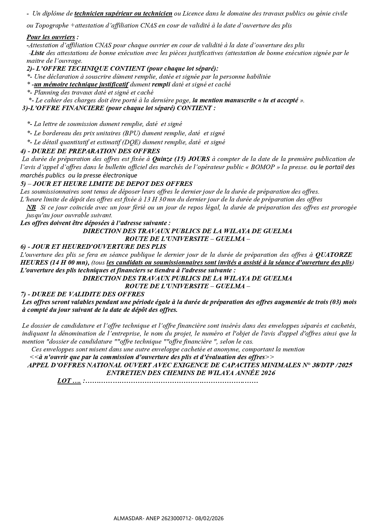 الزبون: DIRECTION DES TRAVAUX PUBLICS DE LA WILAYA DE GUELMA رقم ANEP 2623000712 تاريخ النشر: 2026-02-08 عدد الصفحات: 1/2