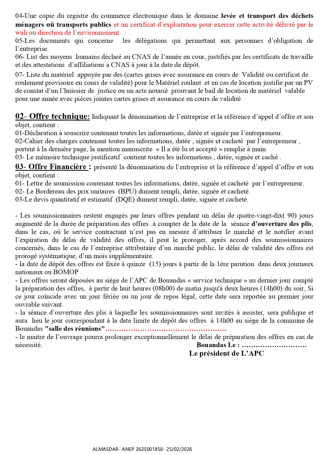 الزبون: Wilaya de : Sétif Daïra de : Bouandas Commune de : Bouandas رقم ANEP 2625001858 تاريخ النشر: 2026-02-25 عدد الصفحات: 1/2