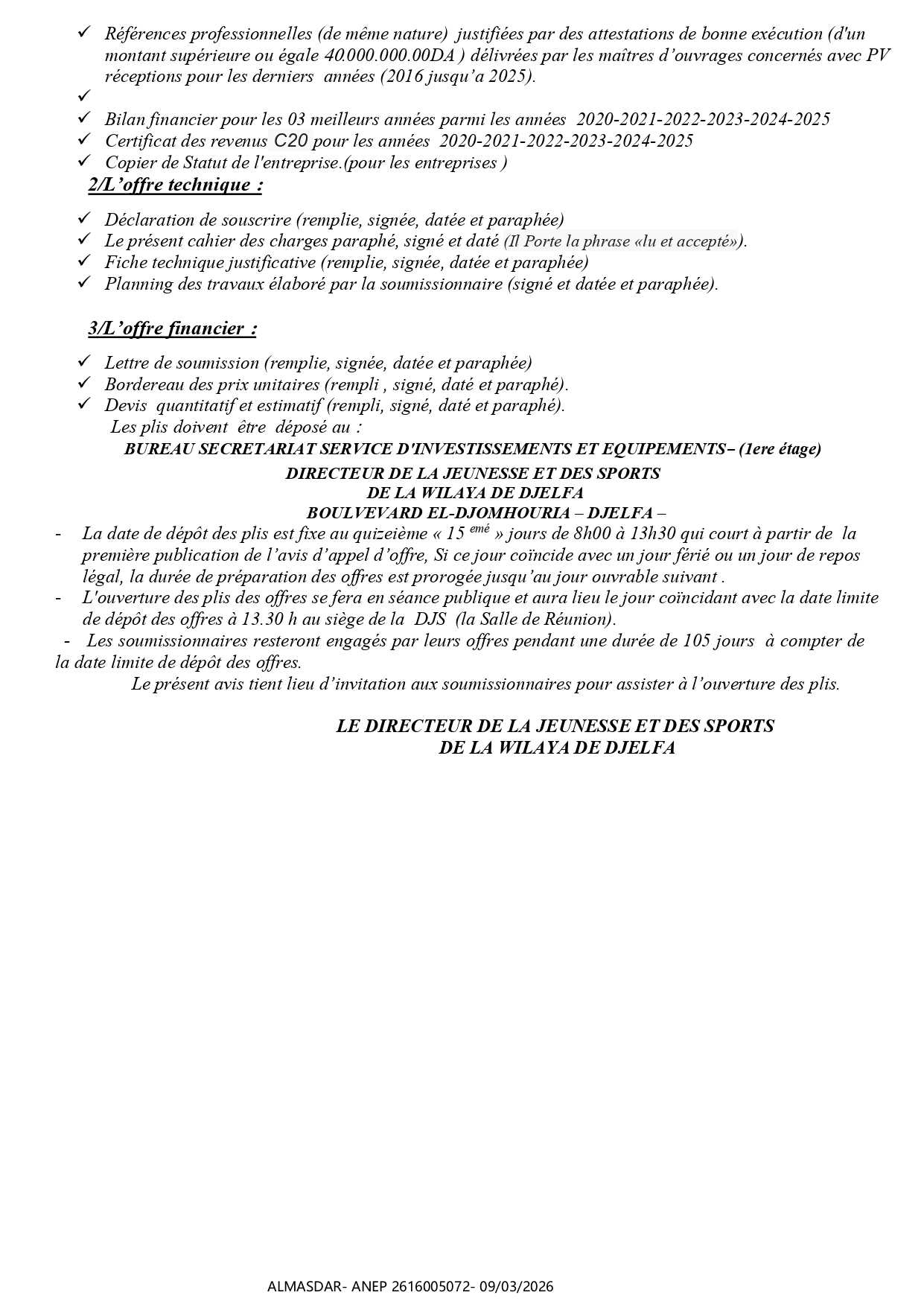 الزبون: DIRECTION DE LA JEUNESSE ET DES SPORTS WILAYA DE DJELFA رقم ANEP 2616005072 تاريخ النشر: 2026-03-09 عدد الصفحات: 1/2