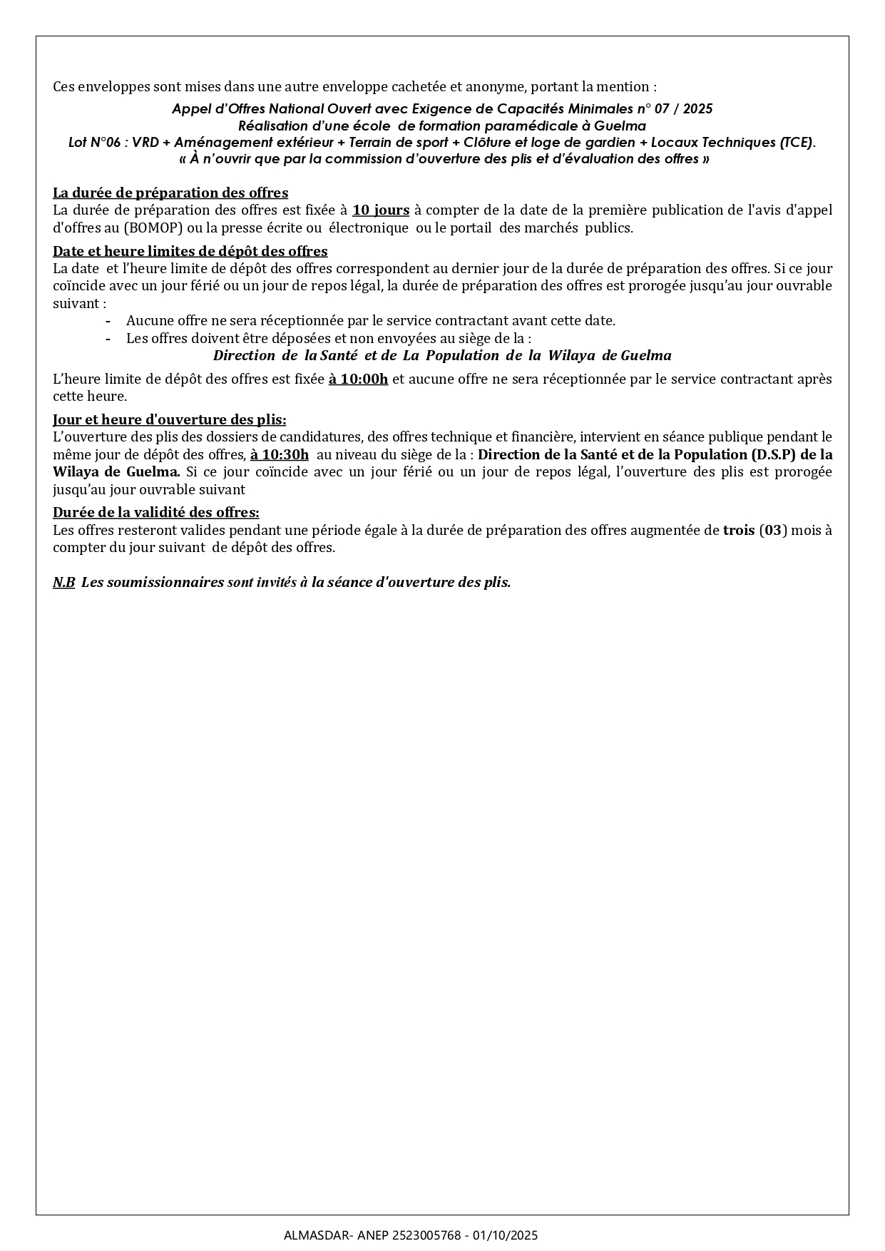 الزبون: DIRECTION DE LA SANTE ET DE LA POPULATION DE WILAYA DE GUELMA رقم ANEP 2523005768 تاريخ النشر: 2025-10-01 عدد الصفحات: 1/2