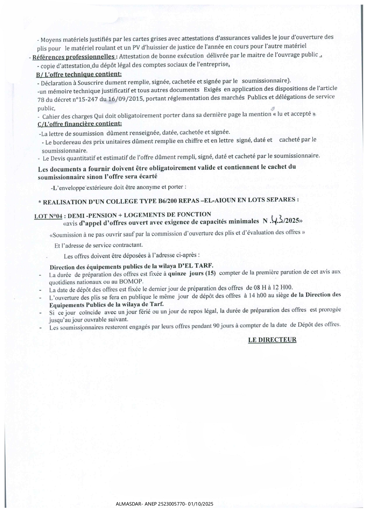 الزبون: DIRECTION DES EQUIPEMENTS PUBLICS WILAYA D'ELTARF رقم ANEP 2523005770 تاريخ النشر: 2025-10-01 عدد الصفحات: 1/2