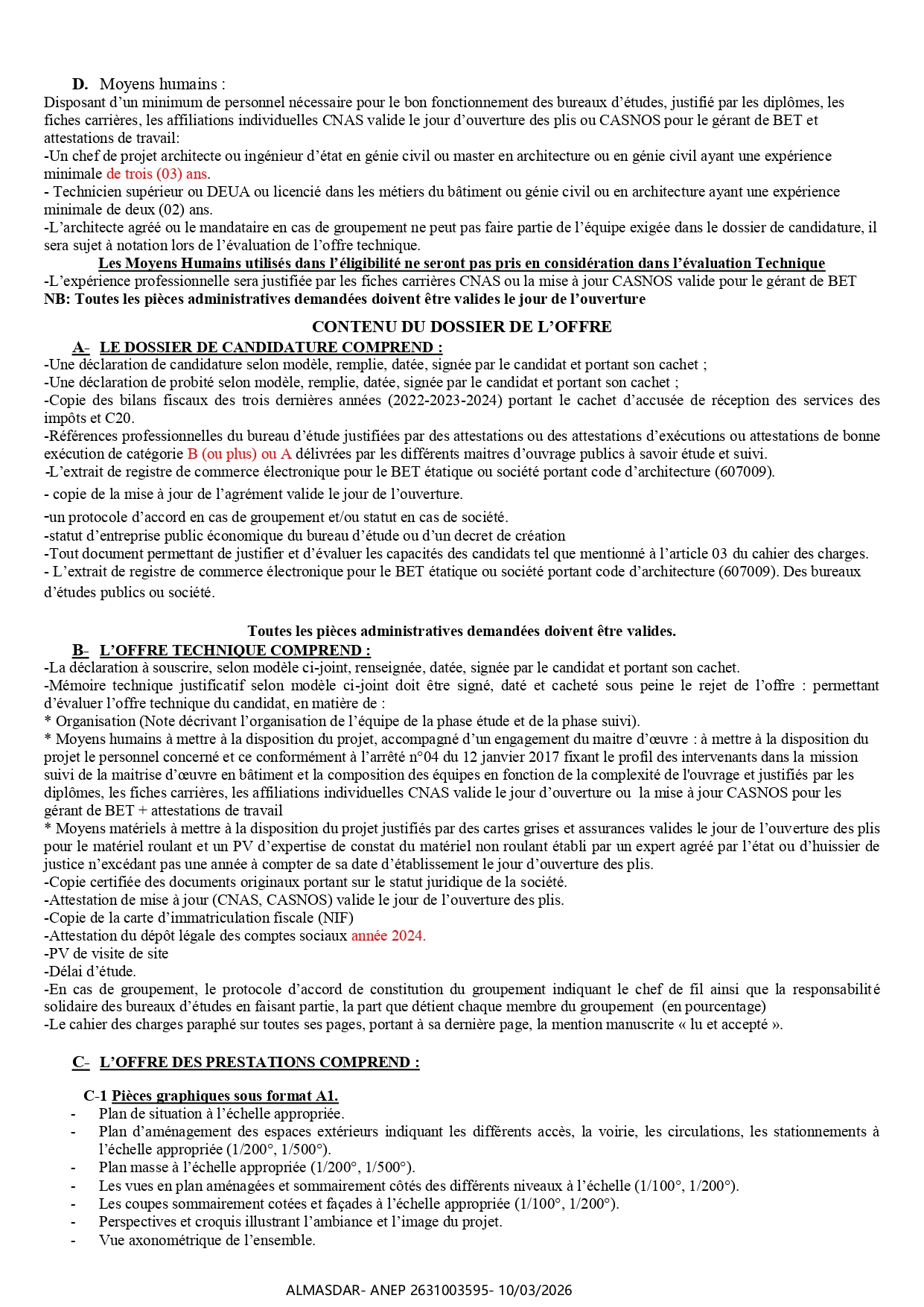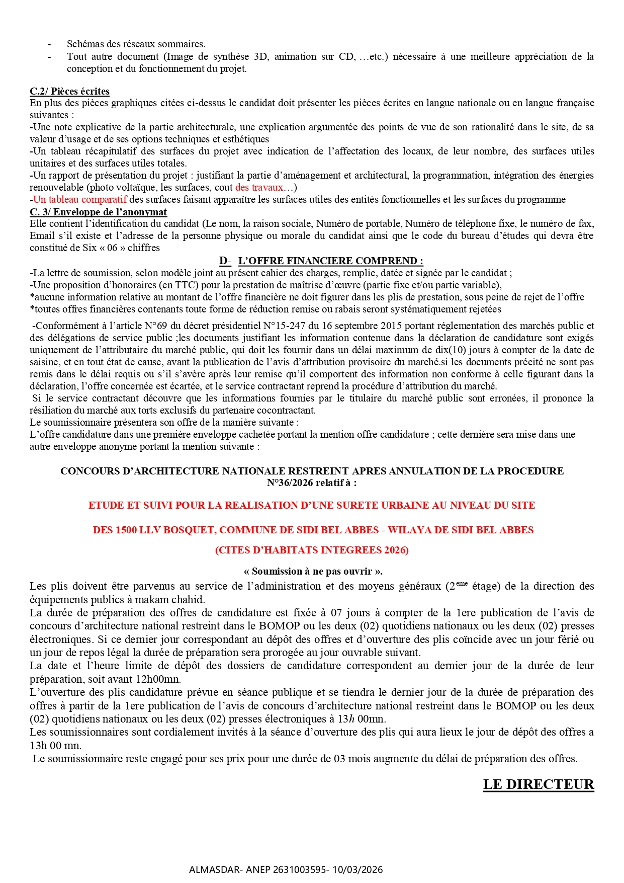 الزبون: WILAYA DE SIDI BEL ABBES DIRECTION DES EQUIPEMENTS PUBLICS رقم ANEP 2631003595 تاريخ النشر: 2026-03-10 عدد الصفحات: 3/4