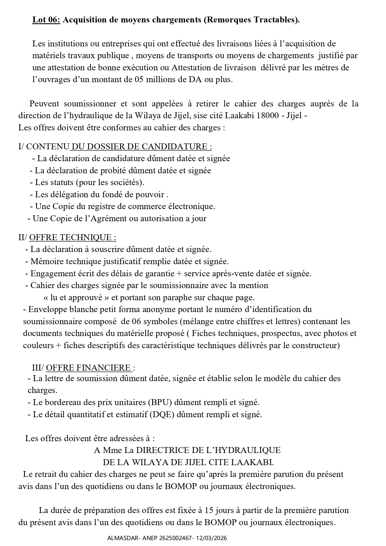 الزبون: DIRECTION DE L’HYDRAULIQUE DE LA WILAYA DE JIJEL رقم ANEP 2625002467 تاريخ النشر: 2026-03-12 عدد الصفحات: 3/4