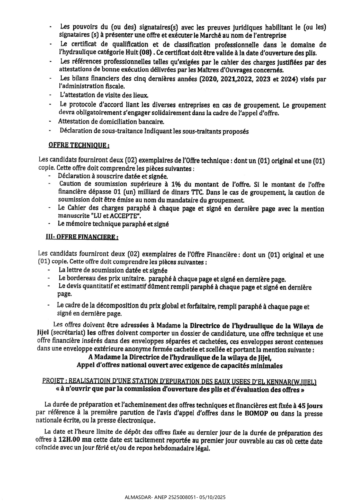 الزبون: DIRECTION DE L'HYDRAULIQUE DE WILAYA DE JIJEL رقم ANEP 2525008051 تاريخ النشر: 2025-10-05 عدد الصفحات: 3/4