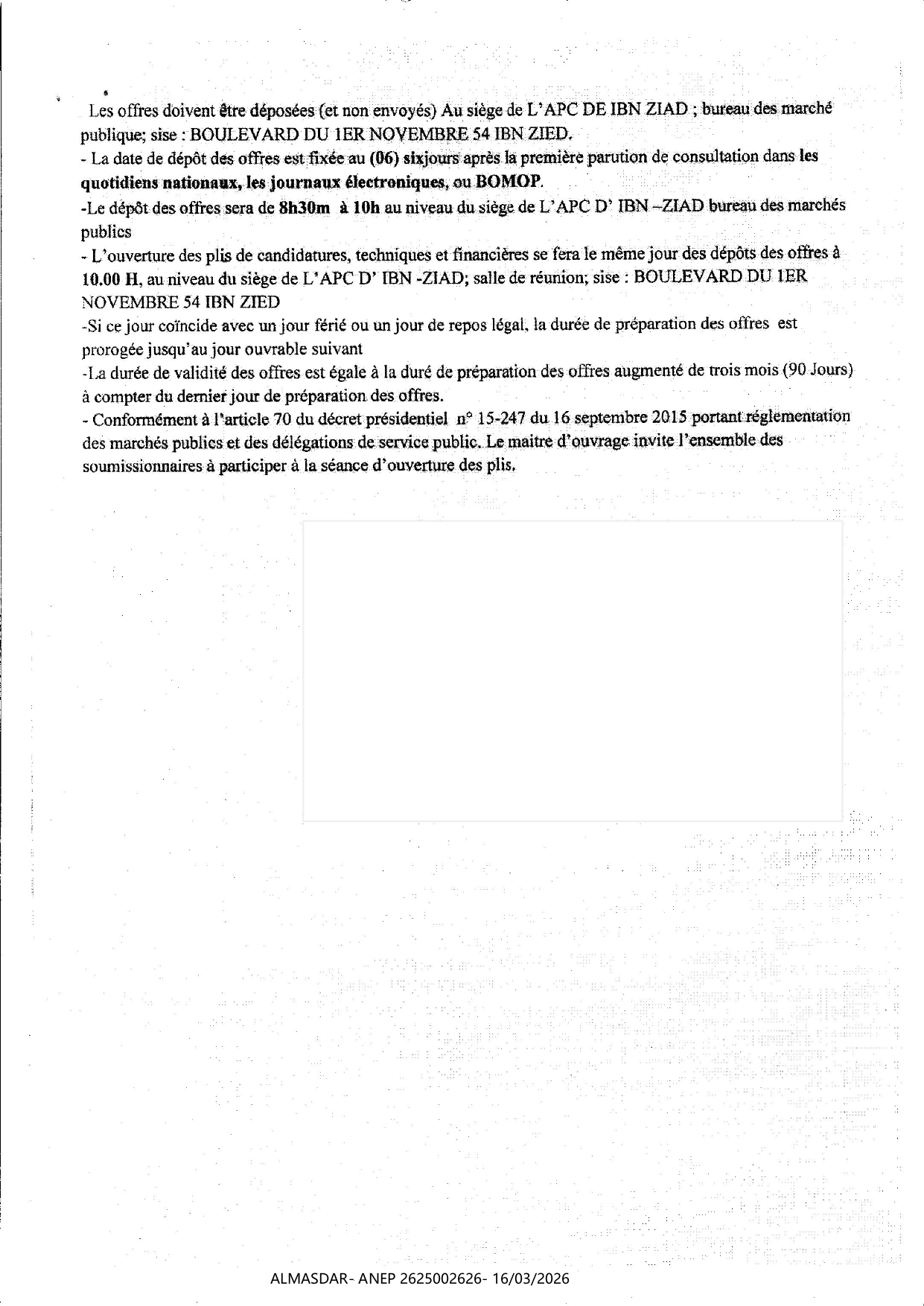 الزبون: COMMUNE IBN ZIAD WILAYA DE CONSTANTINE رقم ANEP 2625002626 تاريخ النشر: 2026-03-16 عدد الصفحات: 1/2