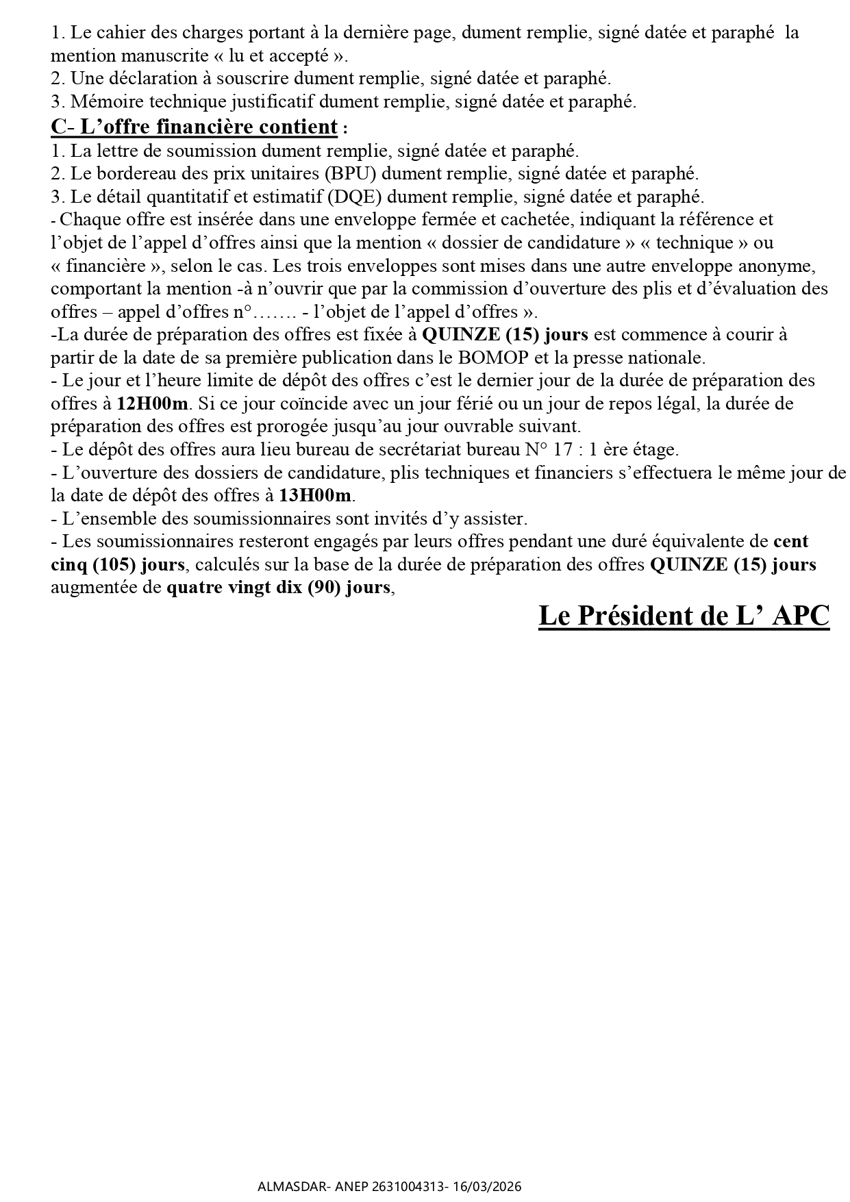 الزبون: WILAYA DE TLEMCEN DAIRA DE BENI BOUSSAID COMMUNE DE BENI BOUSSAID رقم ANEP 2631004313 تاريخ النشر: 2026-03-16 عدد الصفحات: 1/2