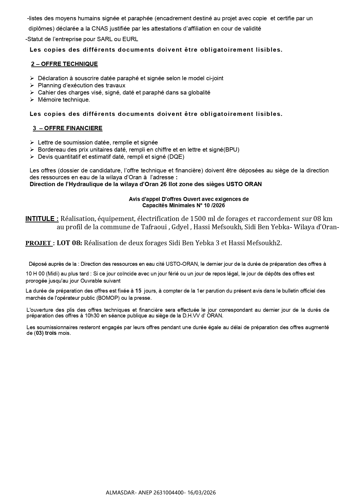 الزبون: DIRECTION DE L’HYDRAULIQUE DE LA WILAYA D’ORAN رقم ANEP 2631004400 تاريخ النشر: 2026-03-16 عدد الصفحات: 1/2