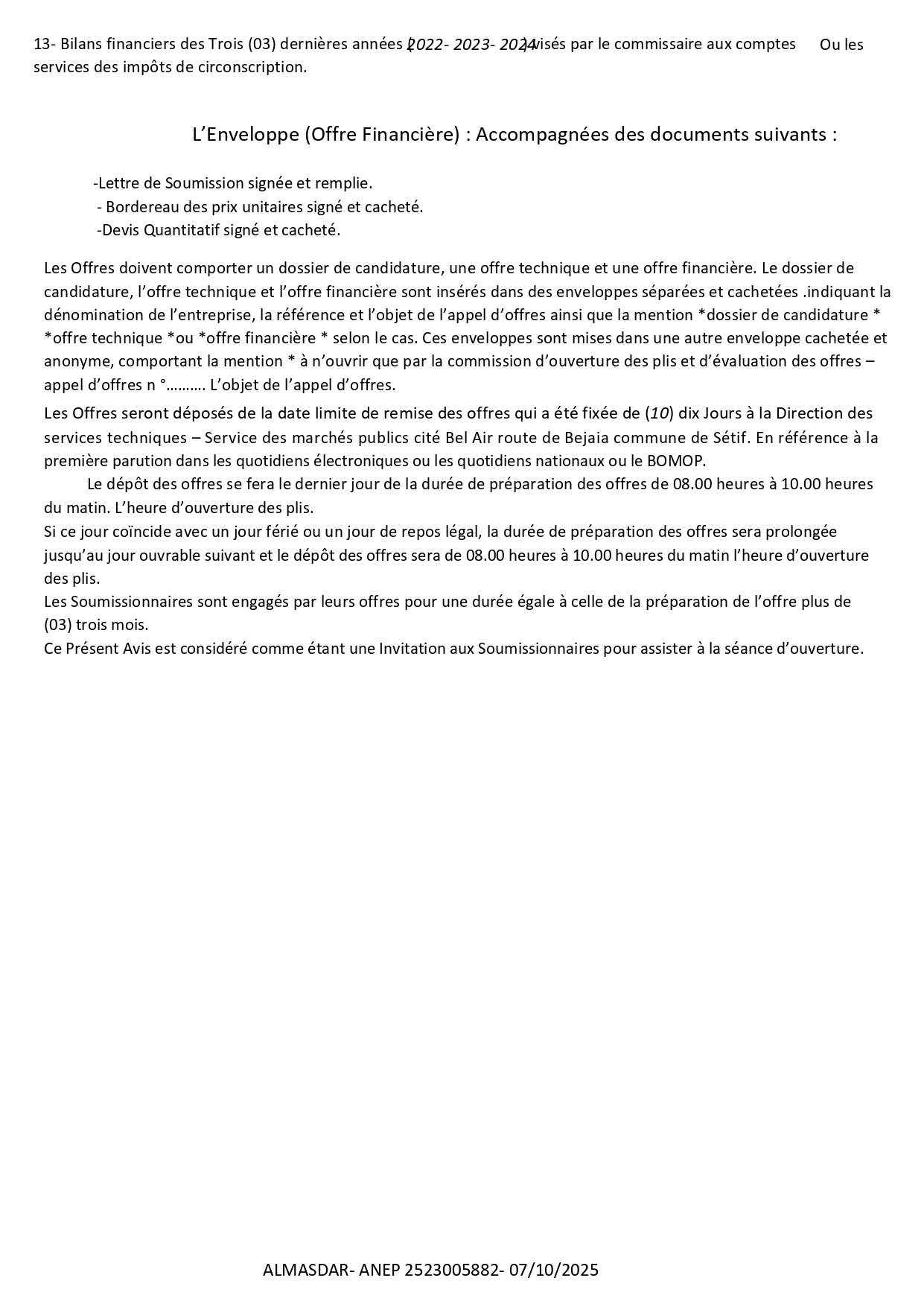 الزبون: COMMUNE DE SETIF WILAYA DE SETIF رقم ANEP 2523005882 تاريخ النشر: 2025-10-07 عدد الصفحات: 1/2