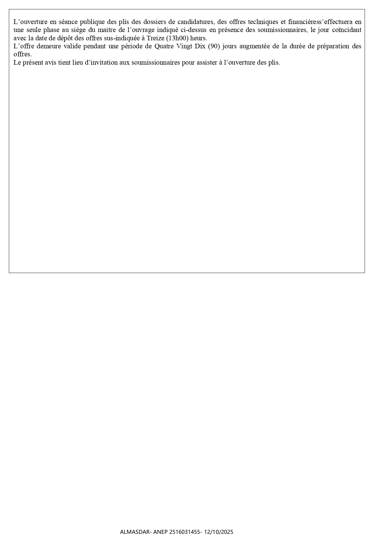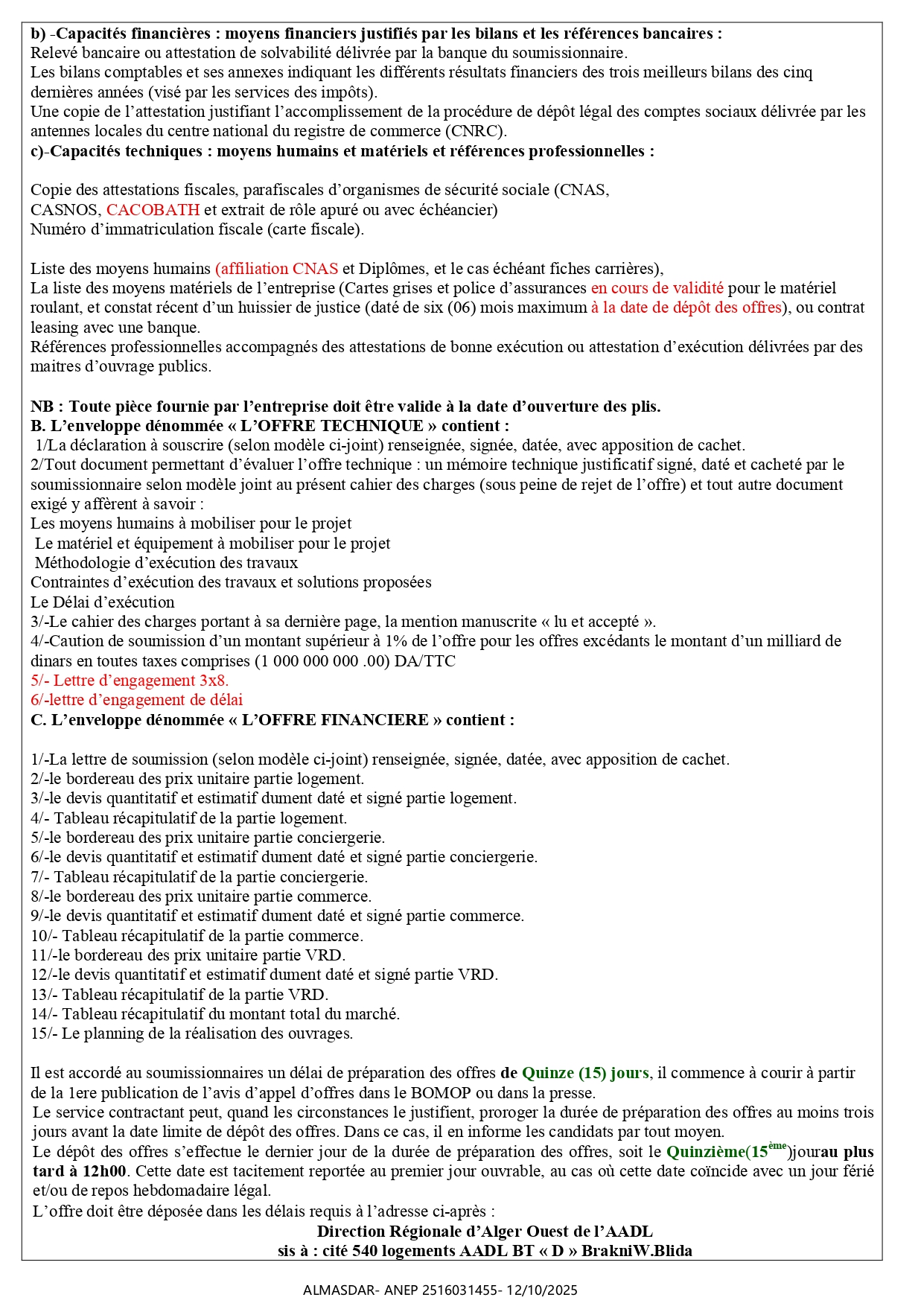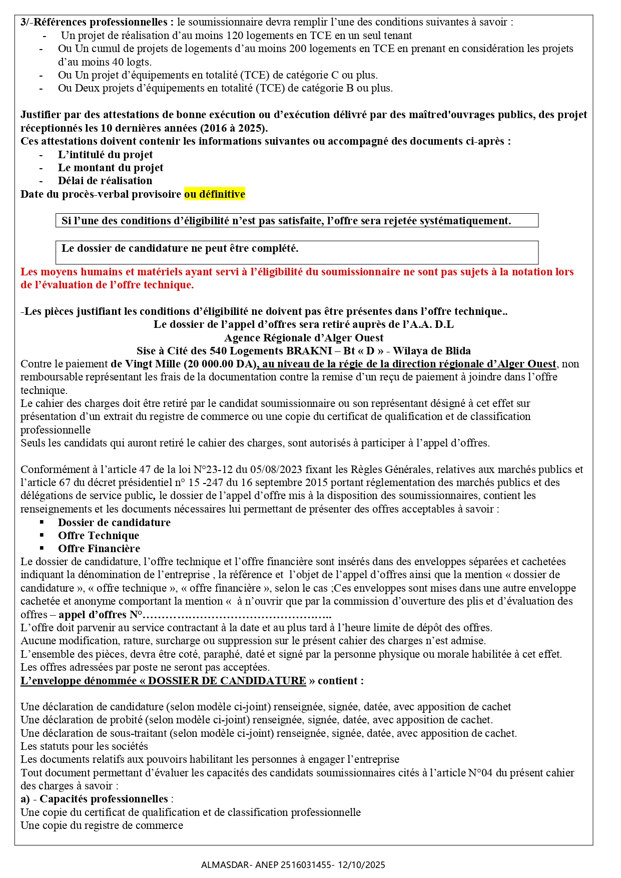 الزبون: Direction régionale d'Alger ouest AADL رقم ANEP 2516031455 تاريخ النشر: 2025-10-12 عدد الصفحات: 1