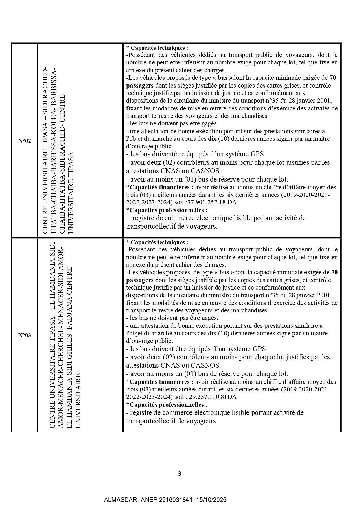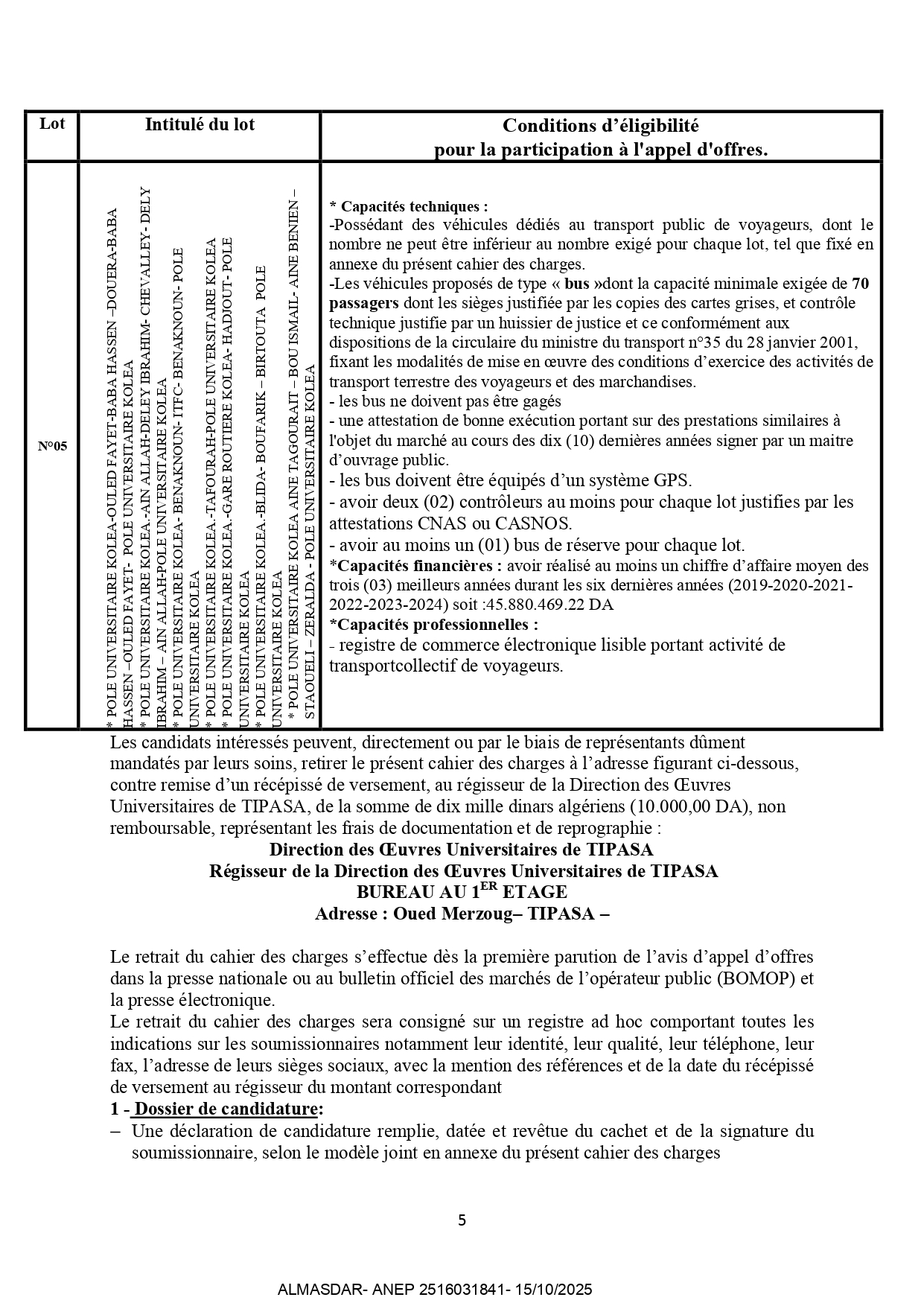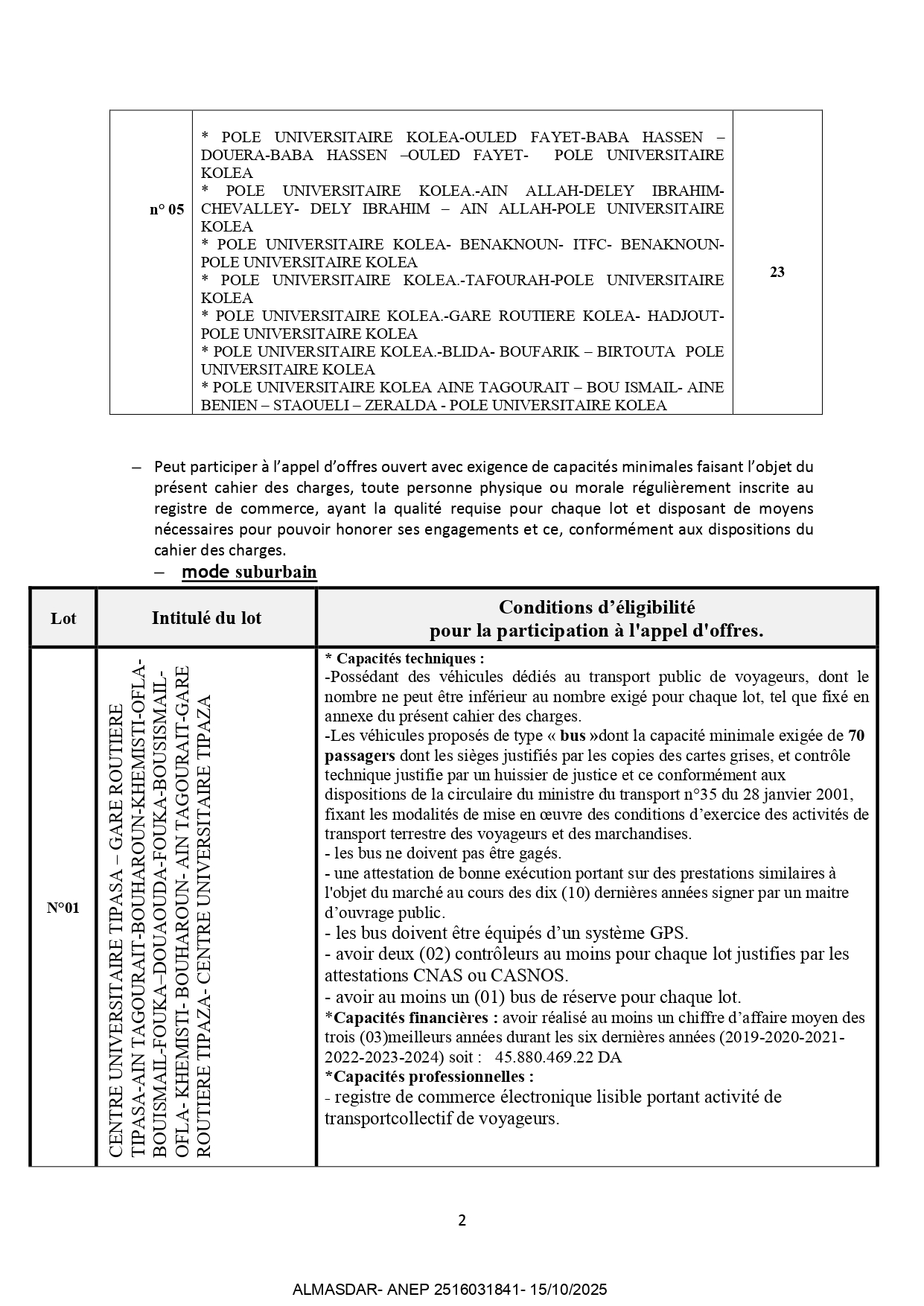 concluion de marches relatifs au transport suburbain des étudiants durant l'année 2026 revelant de la direction des oeuvres universitaires de tipaza portant sur des lots