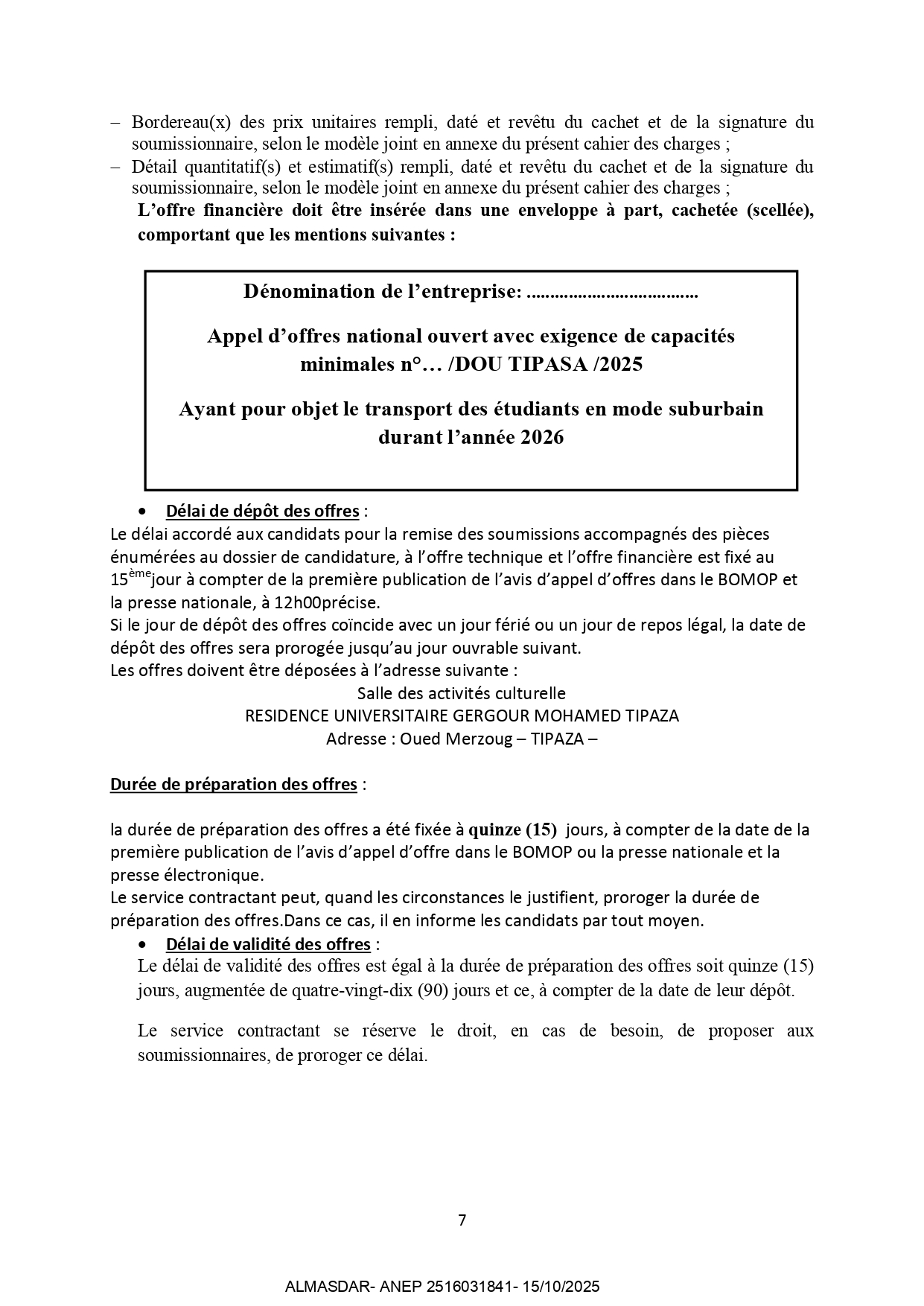 الزبون: office national de oeuvres universitaires رقم ANEP 2516031841 تاريخ النشر: 2025-10-15 عدد الصفحات: 1 - 3/4