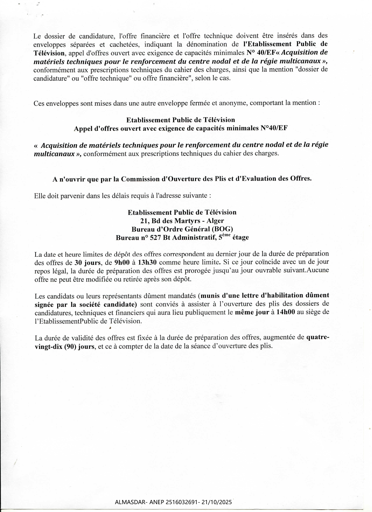 الزبون: Etablissement Public de Télévision رقم ANEP 2516032691 تاريخ النشر: 2025-10-21 عدد الصفحات: 1/2