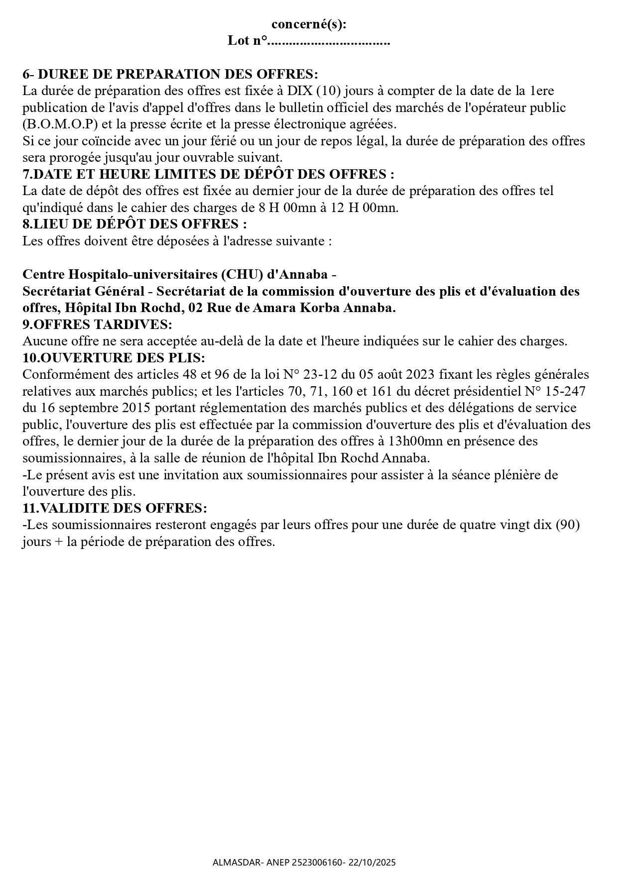 الزبون: CENTRE HOSPITALO-UNIVERSITAIRE D'ANNABA رقم ANEP 2523006160 تاريخ النشر: 2025-10-22 عدد الصفحات: 1