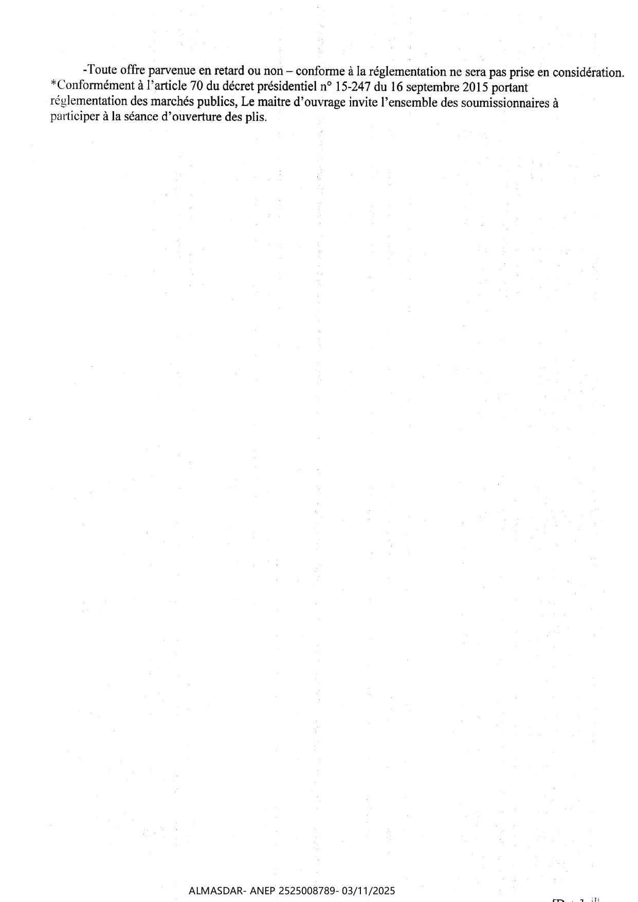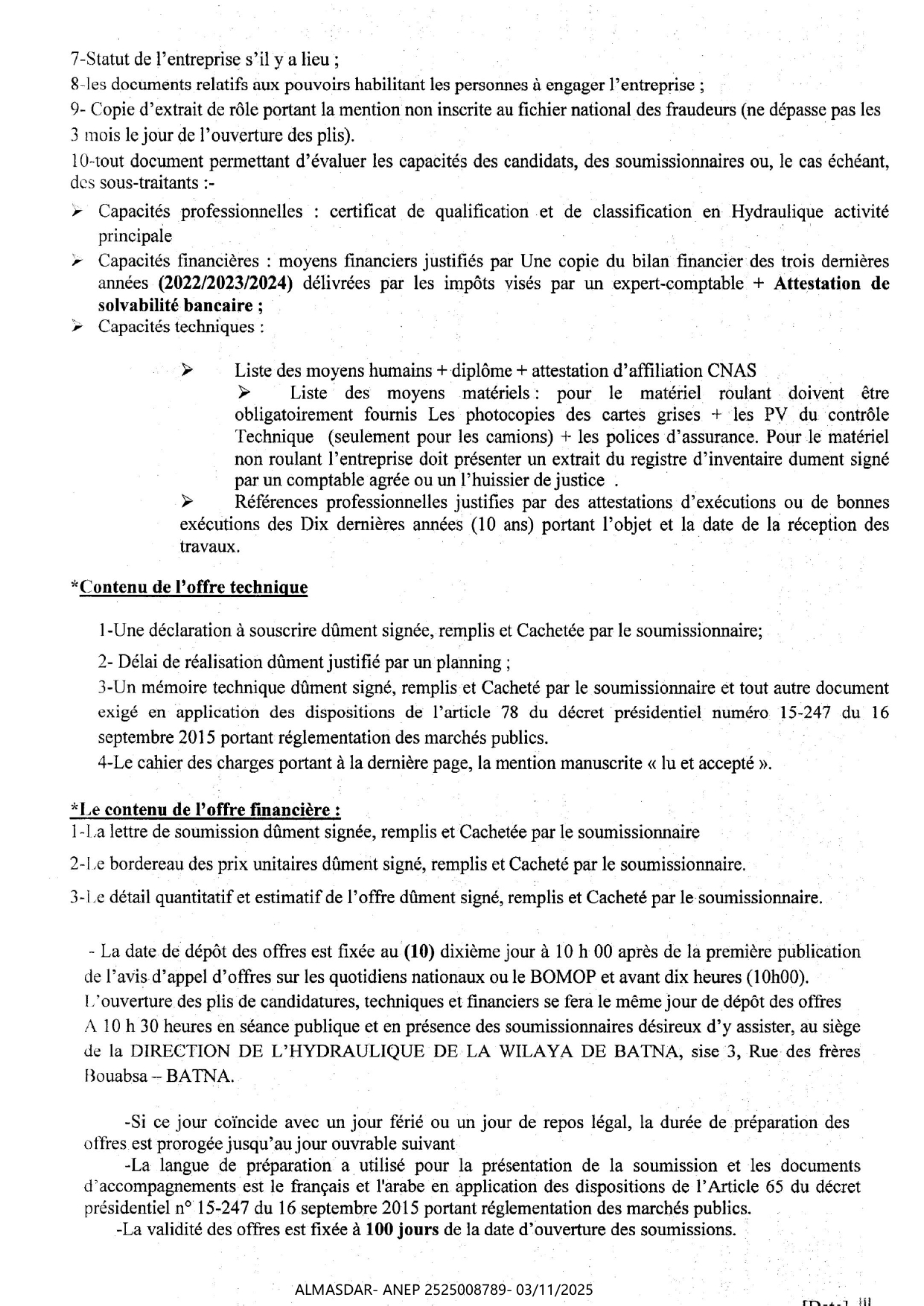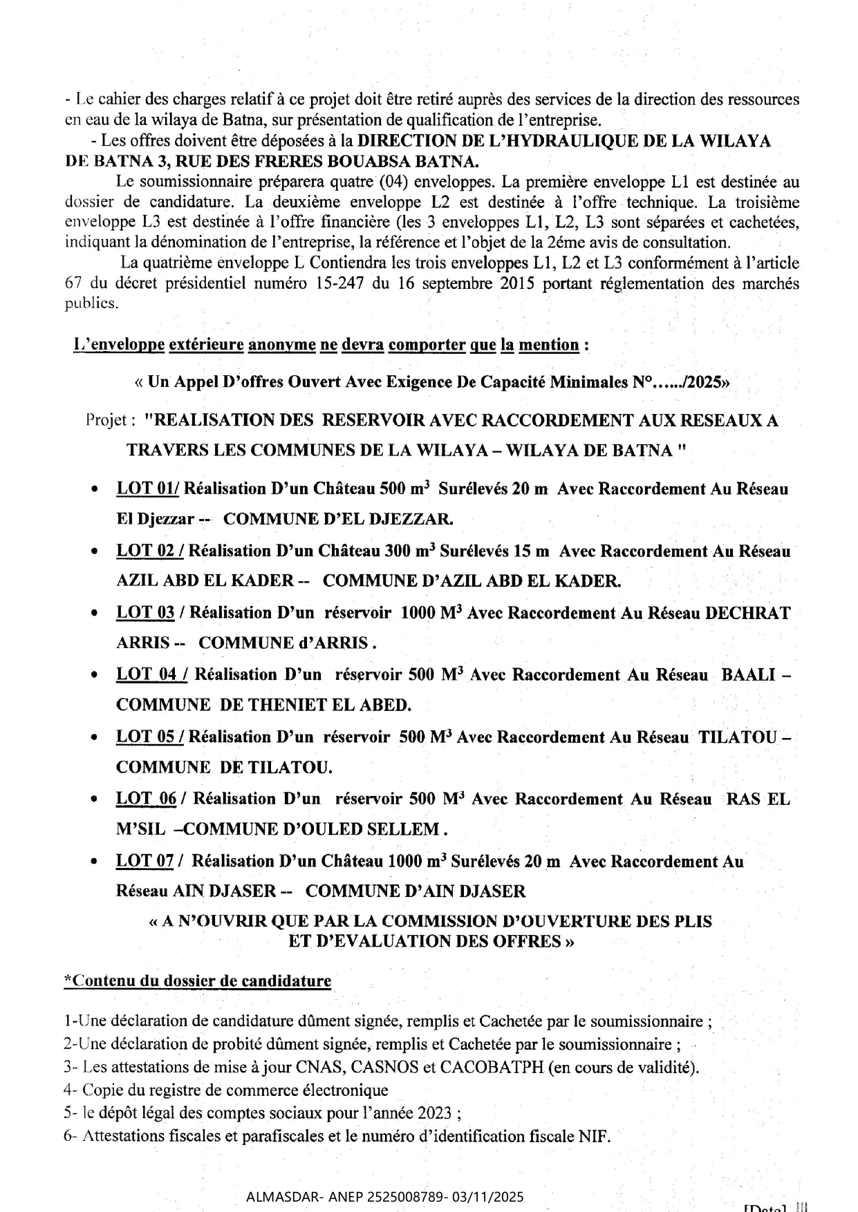 الزبون: DIRECTION DE L'HYDRAULIQUE DE LA WILAYA DE BATNA رقم ANEP 2525008789 تاريخ النشر: 2025-11-03 عدد الصفحات: 1