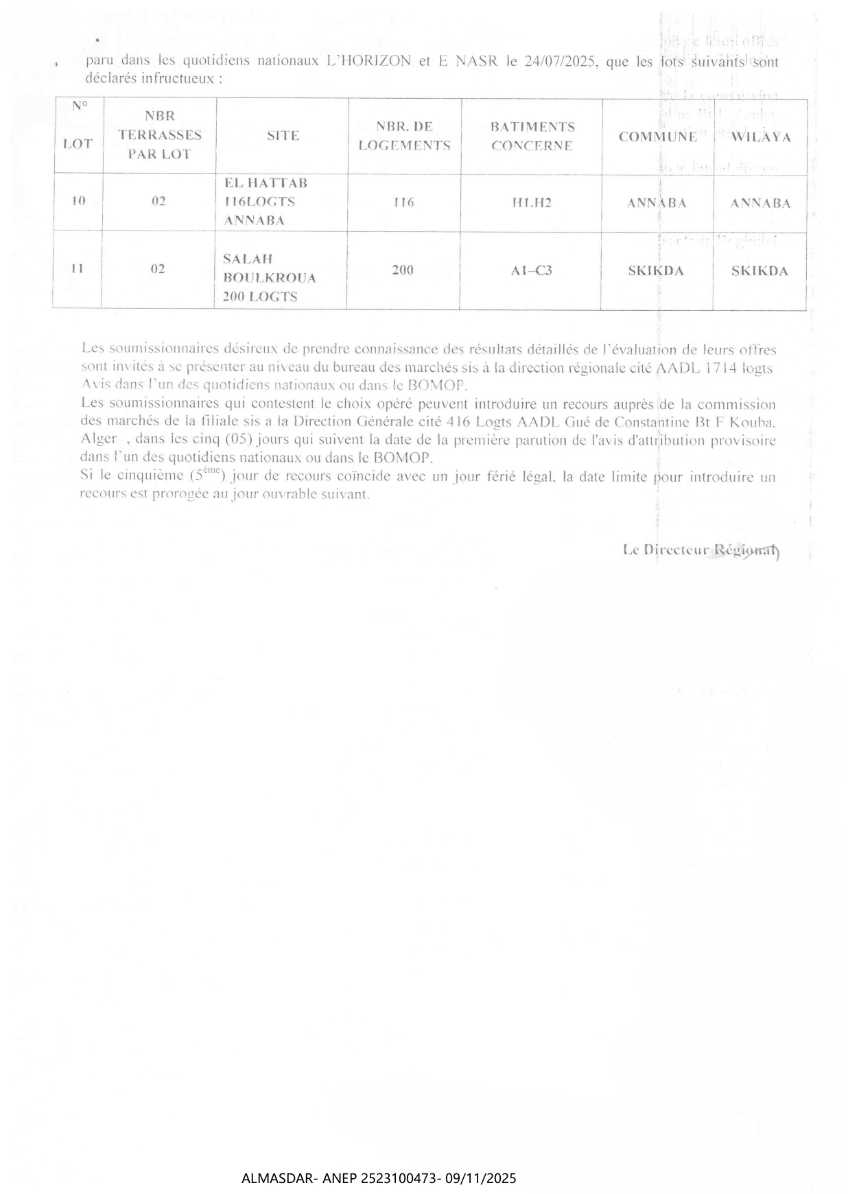 الزبون: AADL GEST IMMO رقم ANEP 2523100473 تاريخ النشر: 2025-11-09 عدد الصفحات: 1/2