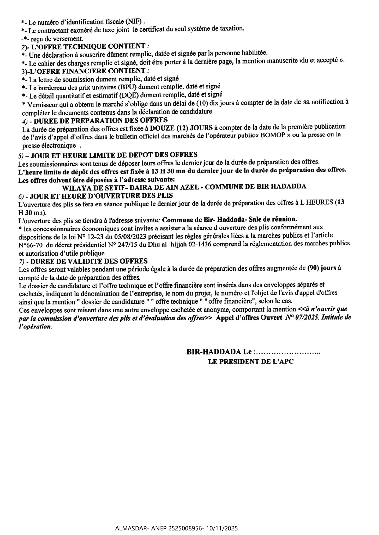 الزبون: COMMUNE DE BIR HADADDA WILAYA DE SETIF رقم ANEP 2525008956 تاريخ النشر: 2025-11-10 عدد الصفحات: 1/2