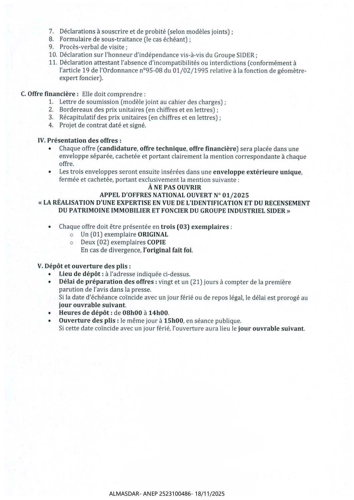 الزبون: GROUPE INDUSTRIEL SIDER ANNABA رقم ANEP 2523100486 تاريخ النشر: 2025-11-18 عدد الصفحات: 1/2