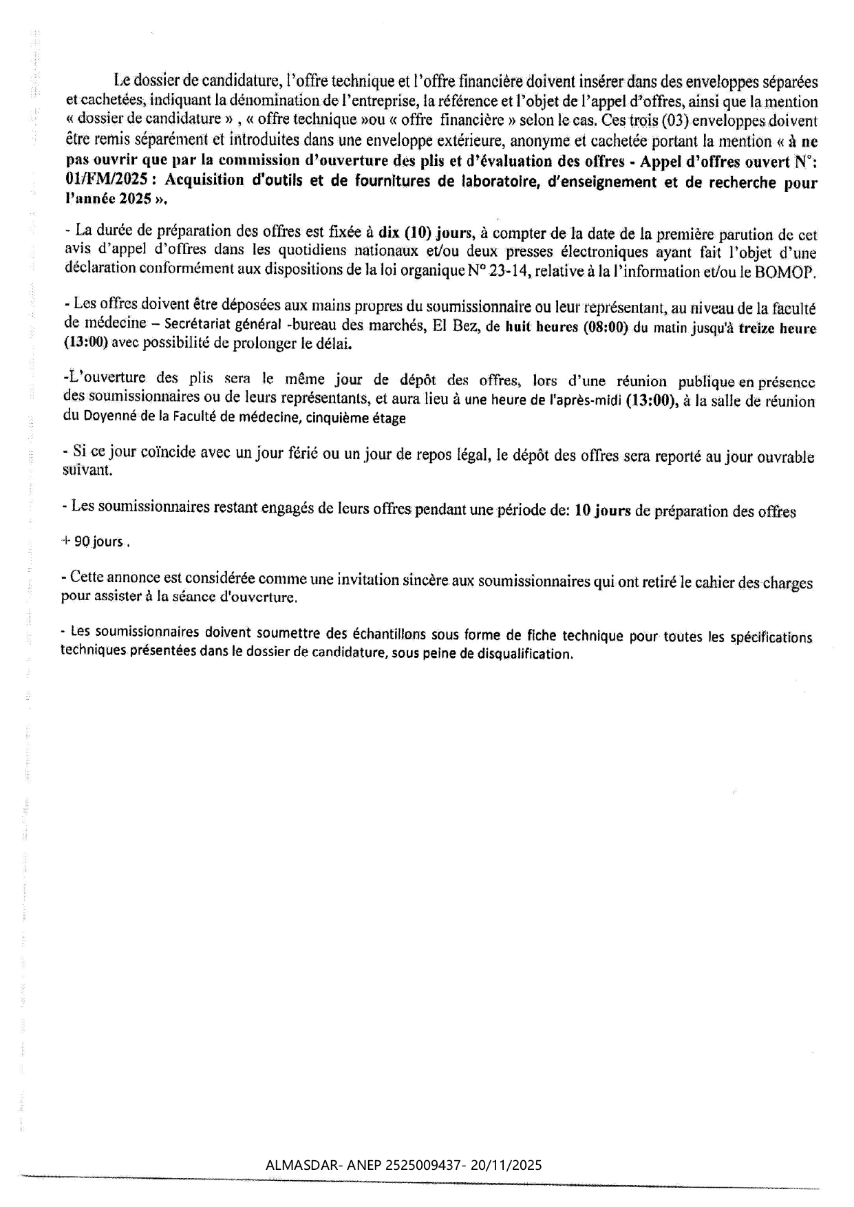 Acquisition d'outils et de fournitures de laboratoire, d'enseignement et de recherche a la faculté de medecine de l'université sétif 1 ferhat abbas, pour l'année 2025
