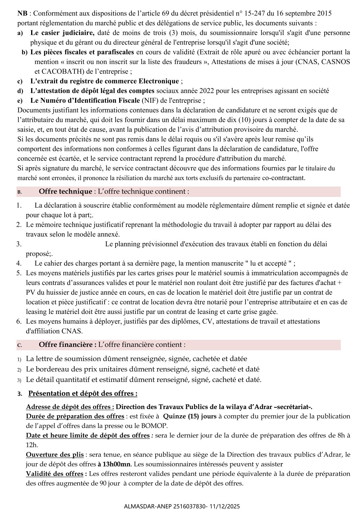 الزبون: WILAYA D’ADRAR DIRECTION DES TRAVAUX PUBLICS رقم ANEP 2516037830 تاريخ النشر: 2025-12-11 عدد الصفحات: 1/2