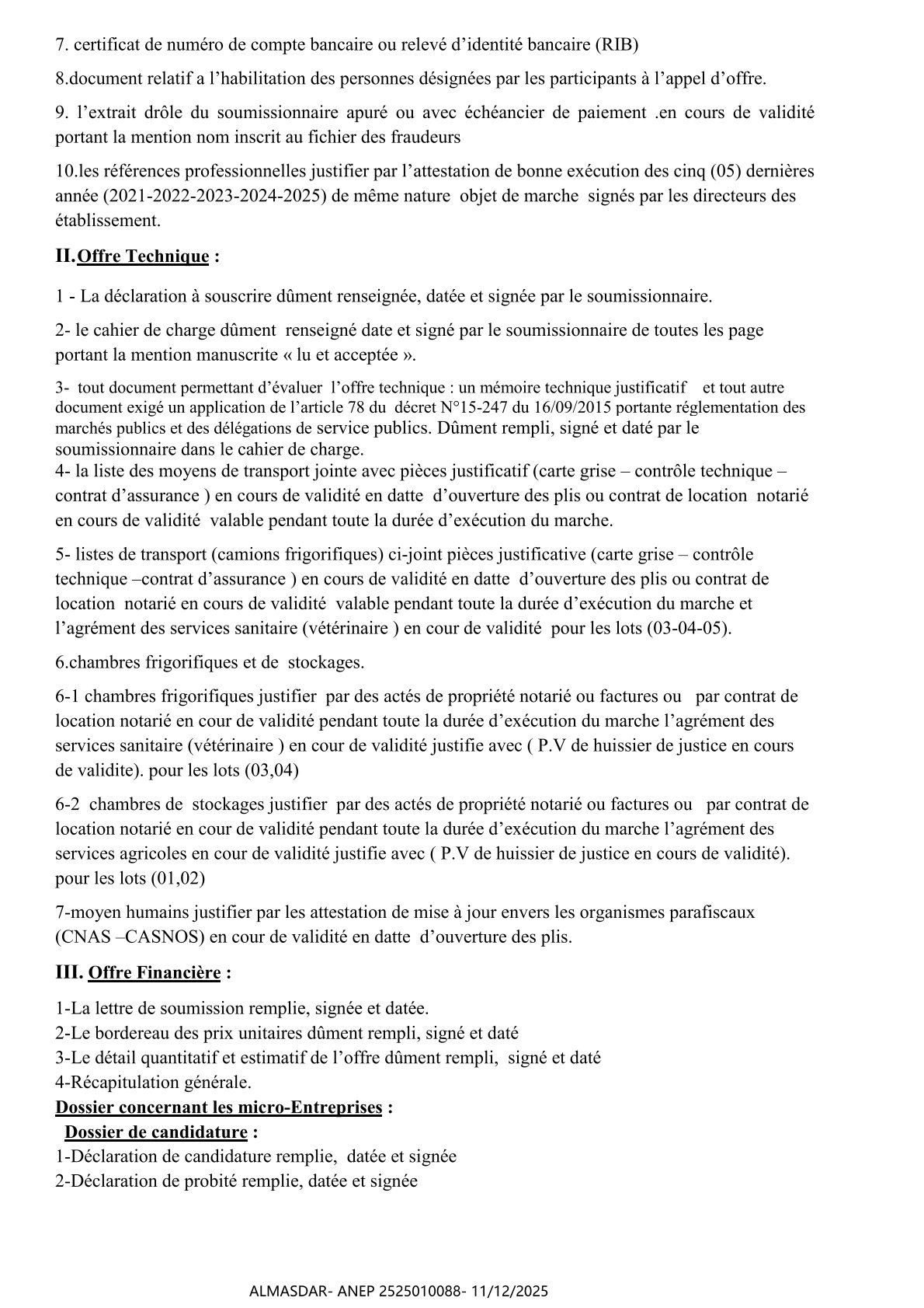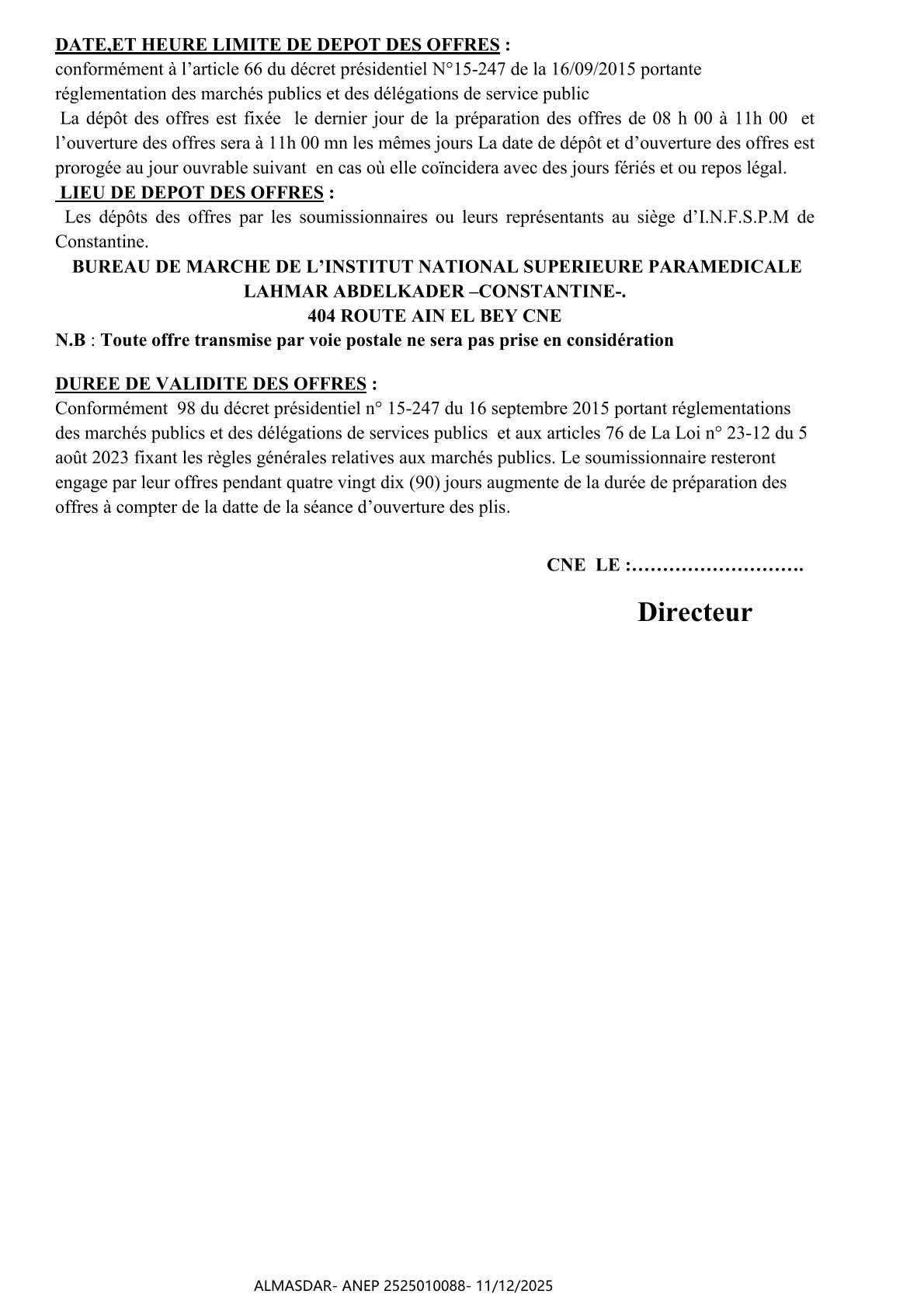 الزبون: INSTITUT NATIONAL DE FORMATION SUPERIEURE PARAMEDICALE LAHMAR ABDELKADER- CONSTANTINE. رقم ANEP 2525010088 تاريخ النشر: 2025-12-11 عدد الصفحات: 1