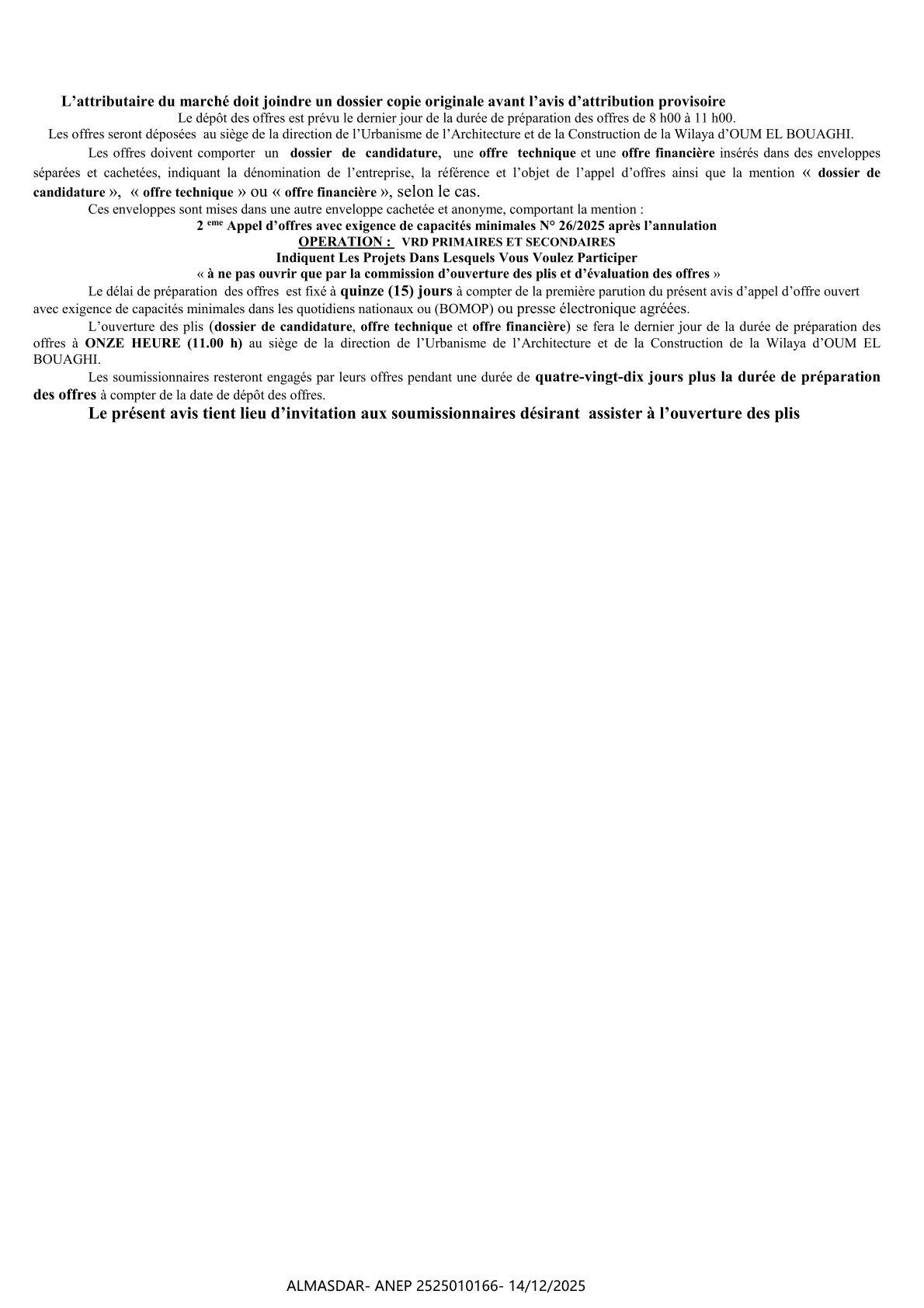 الزبون: Wilaya d’OUM EL BOUAGHI Direction de l’Urbanisme, de l’Architecture Et de la Construction رقم ANEP 2525010166 تاريخ النشر: 2025-12-14 عدد الصفحات: 1/2
