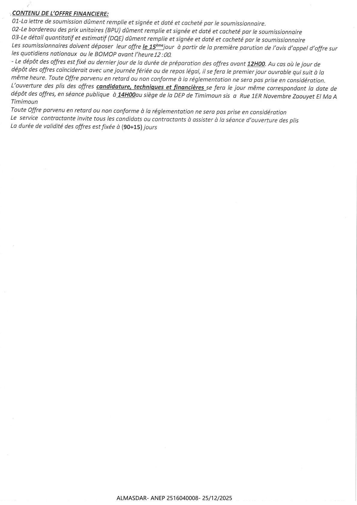 الزبون: direction des equipement publics de la wilaya de timimoun رقم ANEP 2516040008 تاريخ النشر: 2025-12-25 عدد الصفحات: 1/2