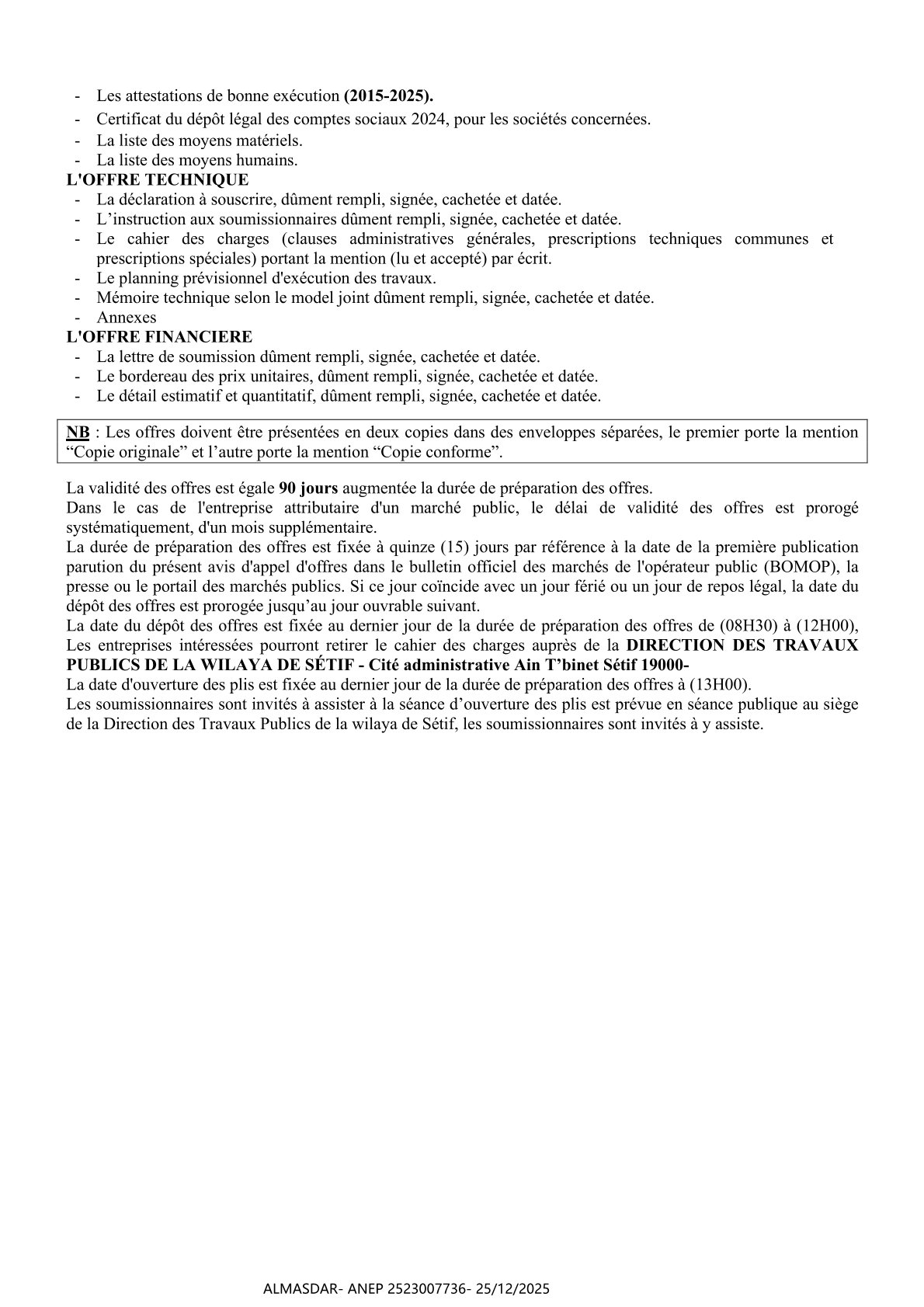 الزبون: Wilaya de Sétif Direction des Travaux Publics رقم ANEP 2523007736 تاريخ النشر: 2025-12-25 عدد الصفحات: 1/2