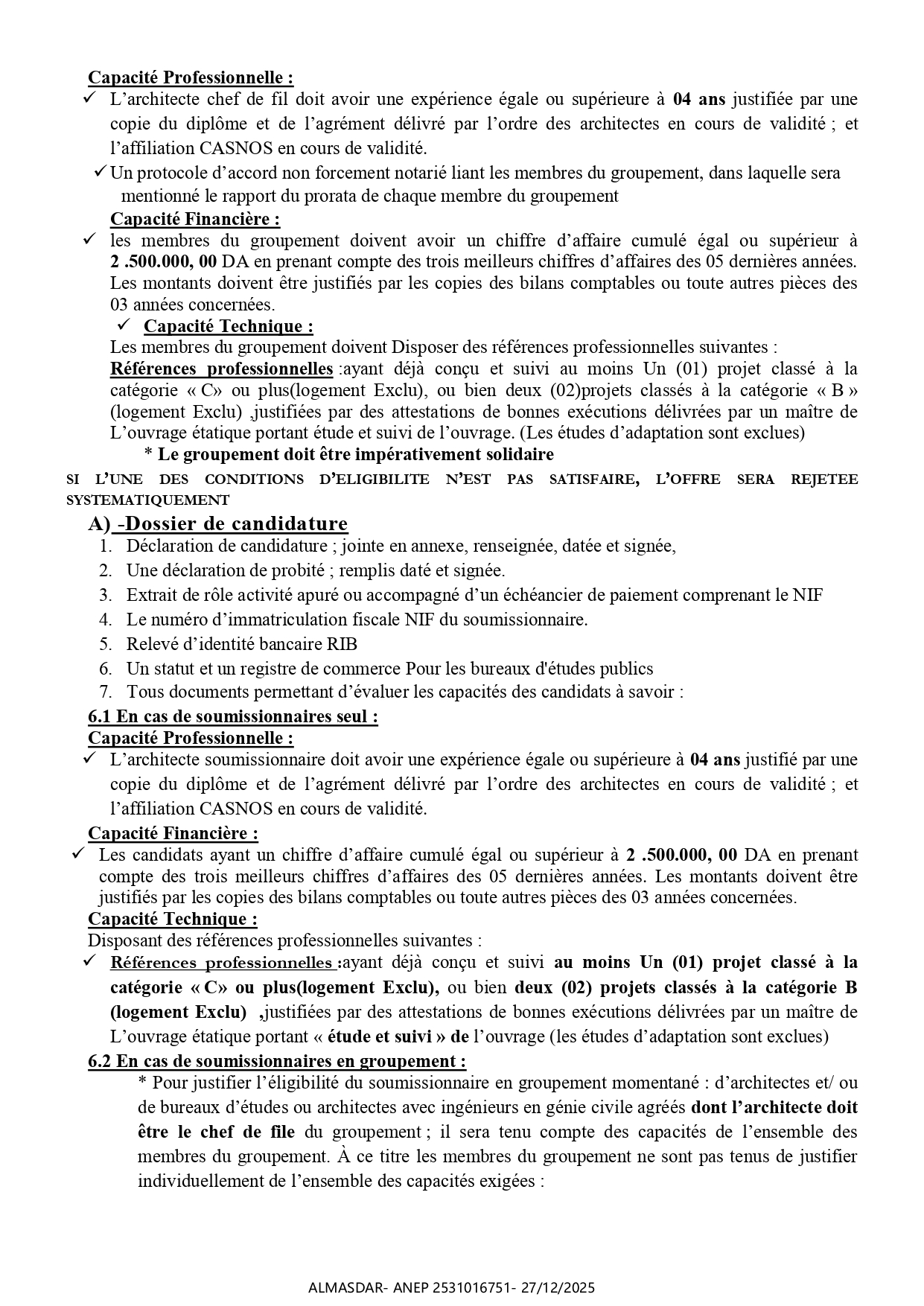 الزبون: DIRECTION DES EQUIPEMENTS PUBLICS DE LA WILAYA D’ORAN رقم ANEP 2531016751 تاريخ النشر: 2025-12-27 عدد الصفحات: 1/2