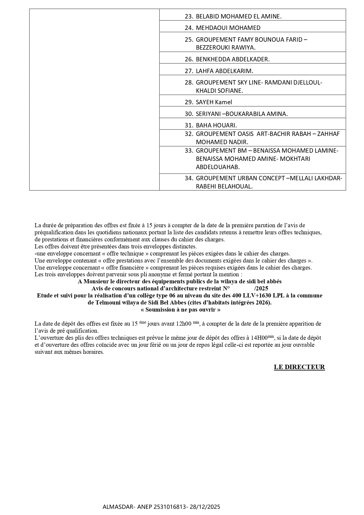 الزبون: WILAYA DE SIDI BEL ABBES DIRECTION DES EQUIPEMENTS PUBLICS رقم ANEP 2531016813 تاريخ النشر: 2025-12-28 عدد الصفحات: 1/2