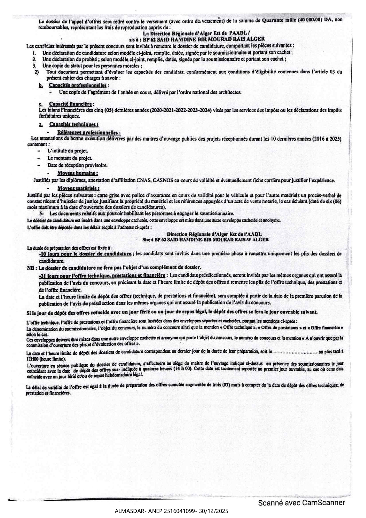 الزبون: direction regionale aadl alger est رقم ANEP 2516041099 تاريخ النشر: 2025-12-30 عدد الصفحات: 1/2