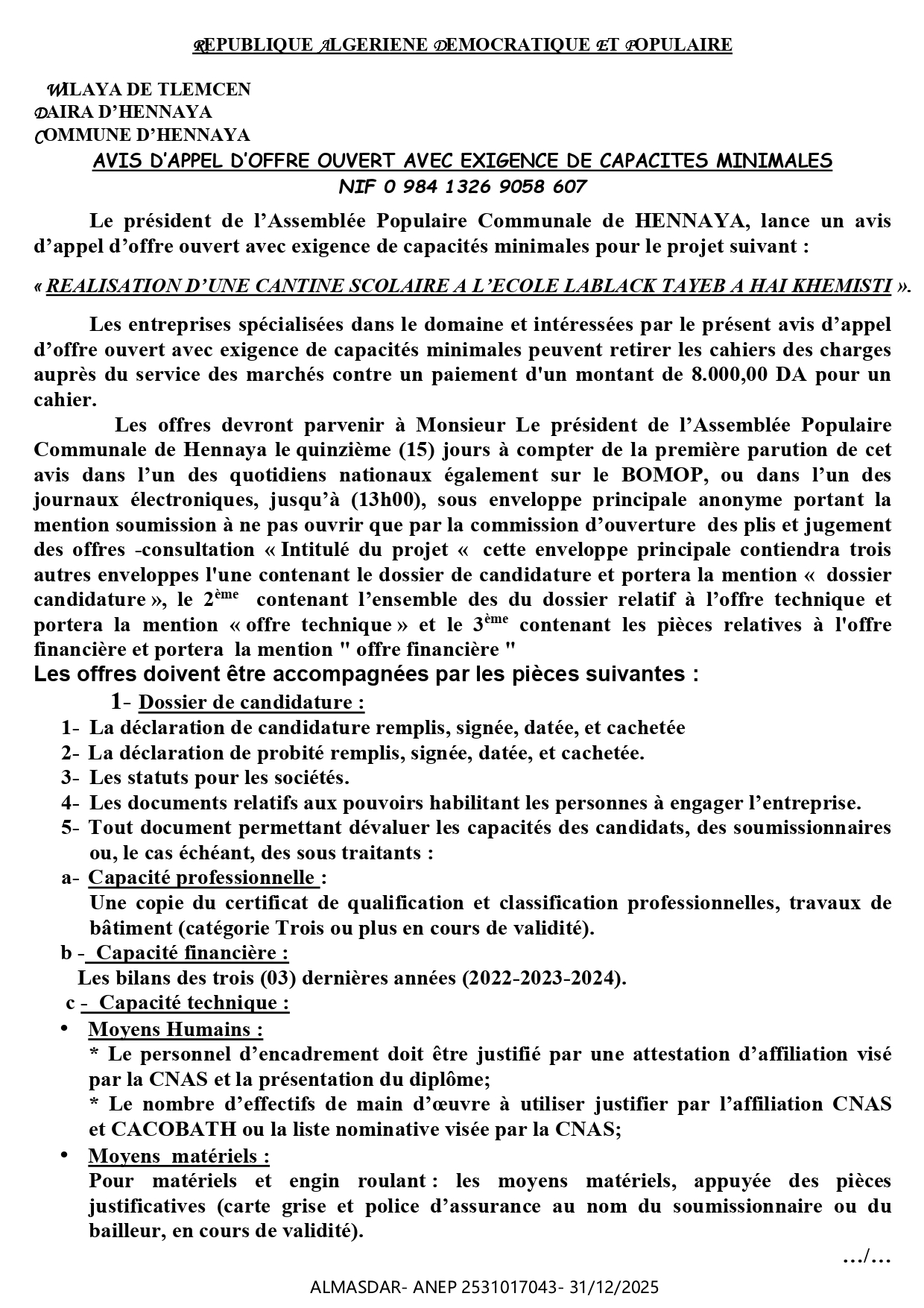 الزبون: W WILAYA DE TLEMCEN D DD CC DAIRA D’HENNAYA C COMMUNE D’HEN رقم ANEP 2531017043 تاريخ النشر: 2025-12-31 عدد الصفحات: 1/2