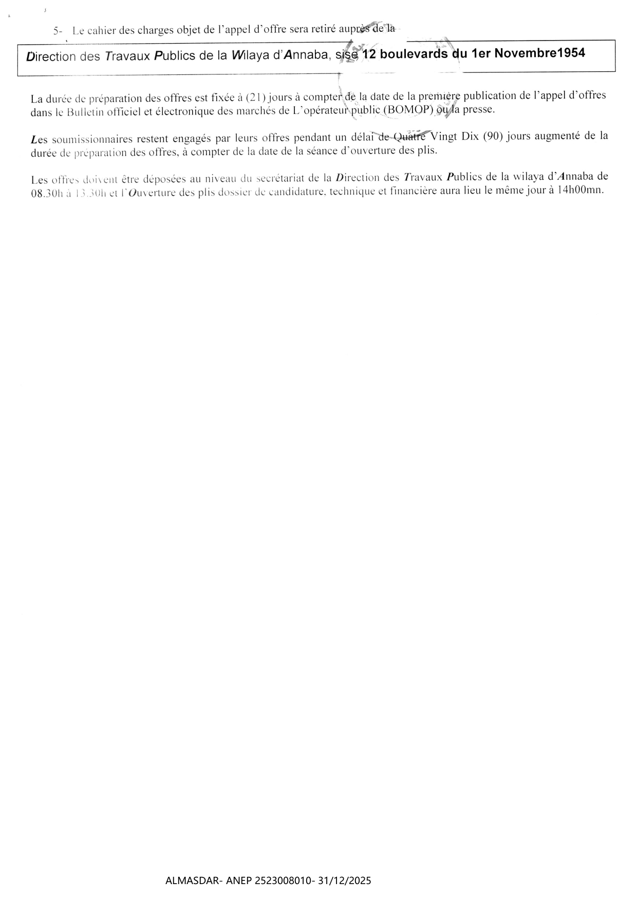 الزبون: wilaya de annaba رقم ANEP 2523008010 تاريخ النشر: 2025-12-31 عدد الصفحات: 3/4